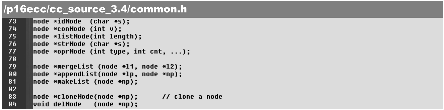 (3)cc.y文件中的产生式序列(列表)和common.h文件中定义的数据结构是简化后的模型,尚不覆盖C语言的语义范畴。