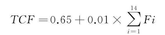 任何需求的实现,总与一定的技术有关。一项需求的技术复杂性特性值 TCF 定义了14项技术特性,对应每一特性有一个从0到5的关联值 Fi (0说明此项技术特性与功能实现毫无关系,5说明此项技术特性是系统建立必不可少的组成部分)。 TCF 即由这些评分合成,公式如下: