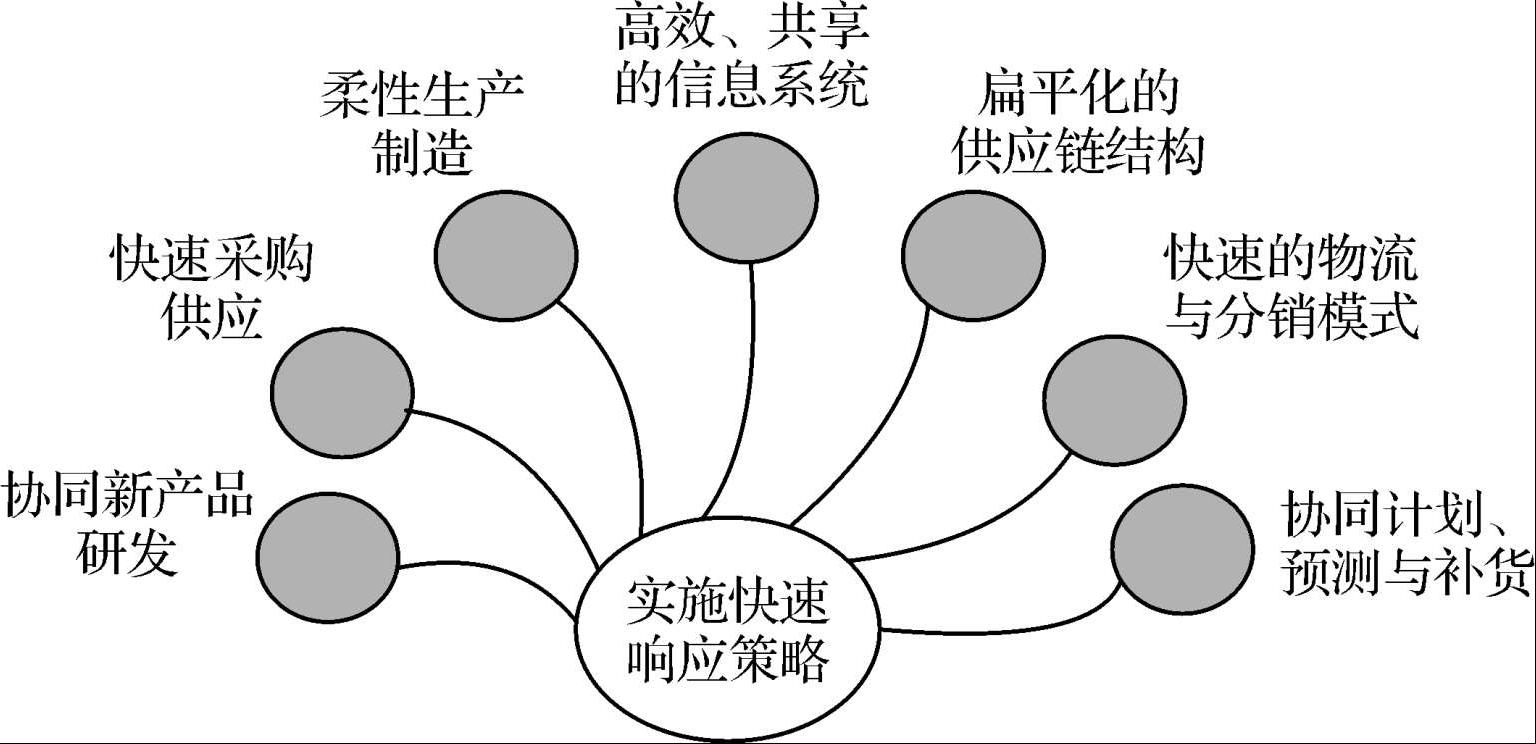 首先,为实施快速响应策略,应缩短新产品研发时间,加快新产品上市的速度,为此,供应链上下游企业应发挥其在原材料、生产制造、顾客需求等方面的独特优势,开展协同研发,以缩短新产品的研发时间,提高新产品研发成功率;其次,通过协同计划、预测与补货系统,提高需求预测的准确性和供应链计划的有效性,实施小批量、快速的订货、补货;第三,为缩短采购与供应时间,应采取电子化的、自动化的小批量的采购模式,充分发挥电子订货系统、电子转账系统、自动结算系统的作用;第四,建立柔性化的生产制造系统,采用多品种、小批量生产模式,缩短产品的生产周期,充分发挥定制化生产、模块化生产模式的作用;第五,应用现代信息技术,建立高效、共享的信息系统,应充分发挥条码技术、信息识别技术、电子数据交换技术以及各种数据共享技术的作用,缩短信息获取、处理、传递以及共享的时间,发挥信息对供应链管理决策的作用;第六,缩短供应链的长度,构建扁平化的供应链结构,以减少实物和信息在供应链中流转的环节;第七,应用现代分销与物流技术,构建快速的物流与分销系统,发挥供应商管理库存(VMI)、越库配送(CD)、连续补货计划(CRP)、多品种小批量配送以及现代分销模式的作用,以缩短实物流动的时间和商品在供应链节点的等待时间;最后,需要强调的是,所有这些细分策略的实施,都离不开供应链成员的战略伙伴关系,因此,实施快速响应策略,供应链成员企业首先应缔结战略伙伴关系。