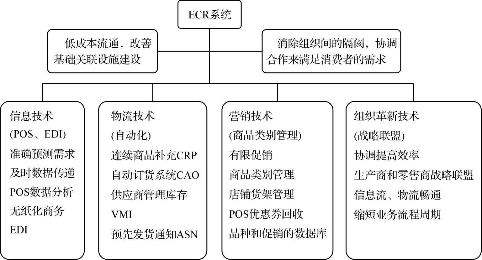 实施供应链ECR,需要将条码、扫描技术、POS系统和EDI集成起来,在供应链(由生产线至付款柜台)节点之间建立一个无纸系统,以确保产品能不间断地由供应商流向最终客户。组成ECR系统的技术要素主要有信息技术、物流技术、营销技术和组织革新技术,ECR系统技术构成如图2-6所示。