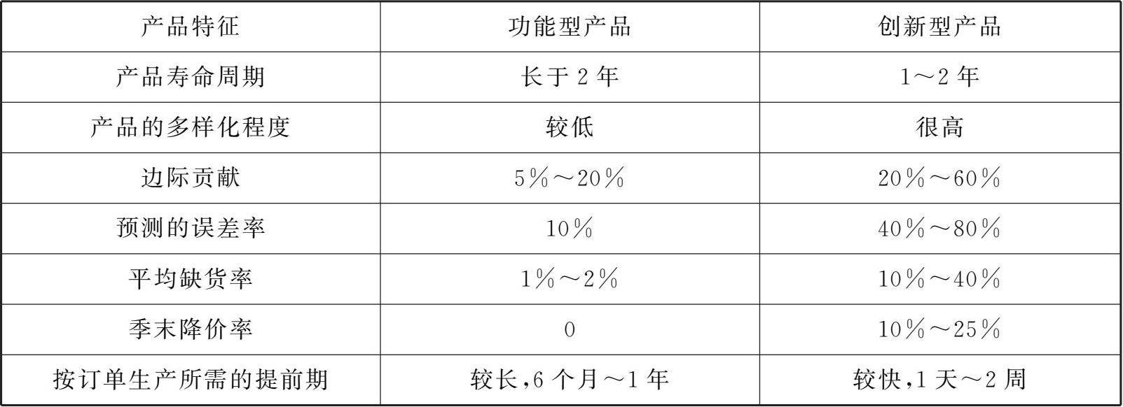 一是产品的类型。按照美国沃顿商学院的马歇尔·费希尔教授的观点,按照产品的需求特征可将产品分为功能型产品和创新型产品。一般来说,功能型产品的边际利润比较低、需求比较稳定。超市所销售的牙膏、方便面、大米等大部分产品都属于功能型产品,这类产品的存货持有成本相对较低。创新型产品是指那些满足客户个性化需求或时尚需求的产品。这些产品的更新换代速度比较快,边际利润相对较高,需求极不稳定,存货持有成本较高,如流行的服饰、电子产品等。表2-4比较了两种不同类型的产品之间的主要区别。
