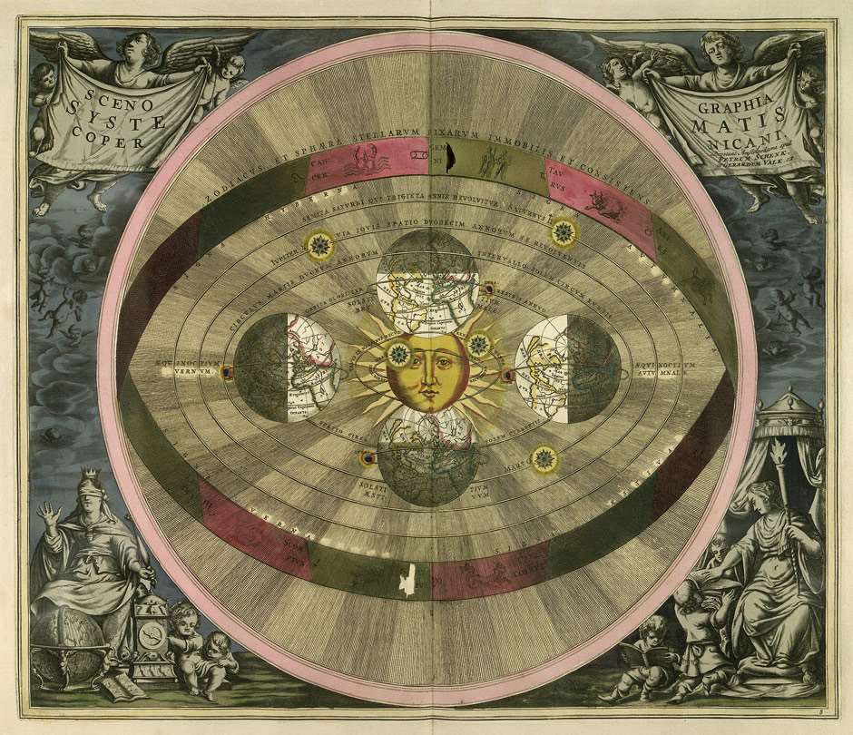 图 1.3 哥白尼与日心说示意图。太阳被放在中心位置,各大行星以不同速度绕太阳运行,月球则绕地球运动。日心说相对于地心说有质的飞跃,但要注意在真实的宇宙中,太阳并不处于宇宙的中心。宇宙其实是没有中心的 │图源:上:Wikipedia;下:Andreas Cellarius,1660