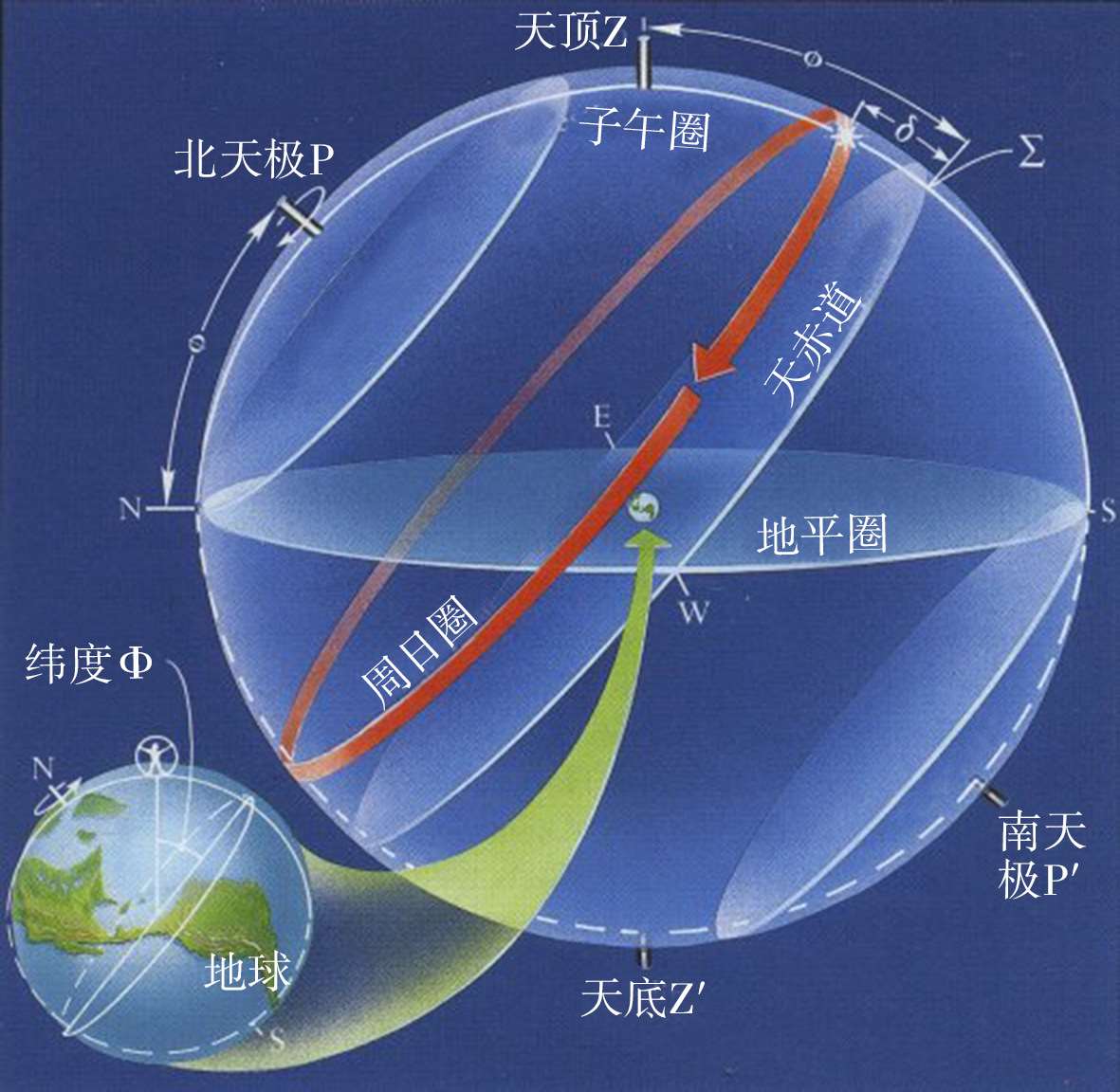 从你所在地球表面处观察星空,最常用的自然是 地平坐标系 (参考图 1.4)。地平面与天球相交的大圆是 地平圈 ,它有东(E)、西(W)、南(S)、北(N)四个方向。地平圈的两个天球极是 天顶 和 天底 。经过点E、天顶、点S、天底这四个点的天球大圆是 子午圈 。天体周日视运动经过子午圈时,称为 中天 。特别地,经过天顶所在的子午圈半圆时称为 上中天 ,经过天底所在的子午圈半圆时称为 下中天 。
