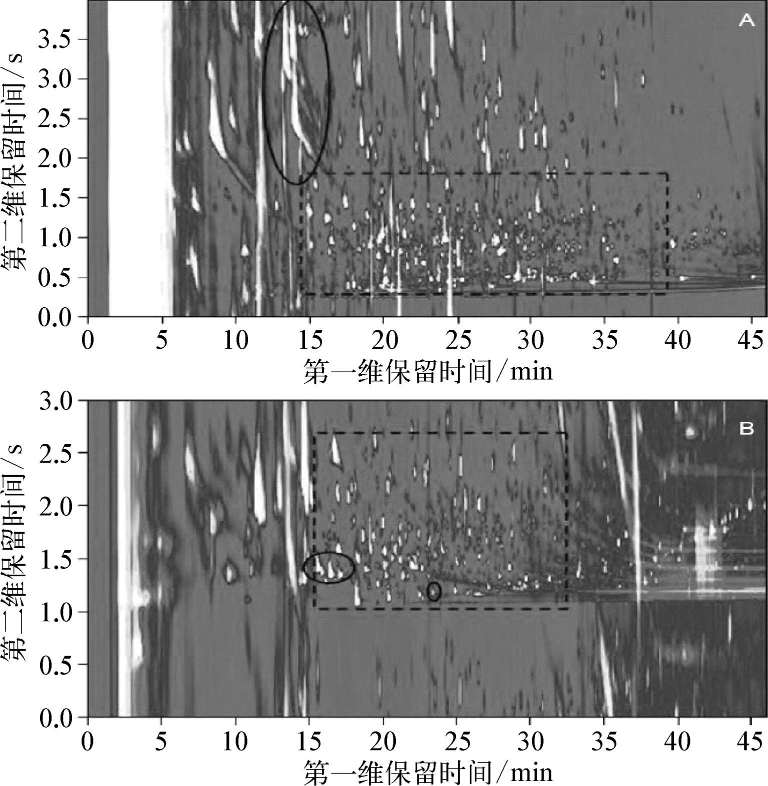 (A)中虚线区域主要为非极性组分,(B)中虚线区域主要为极性组分。