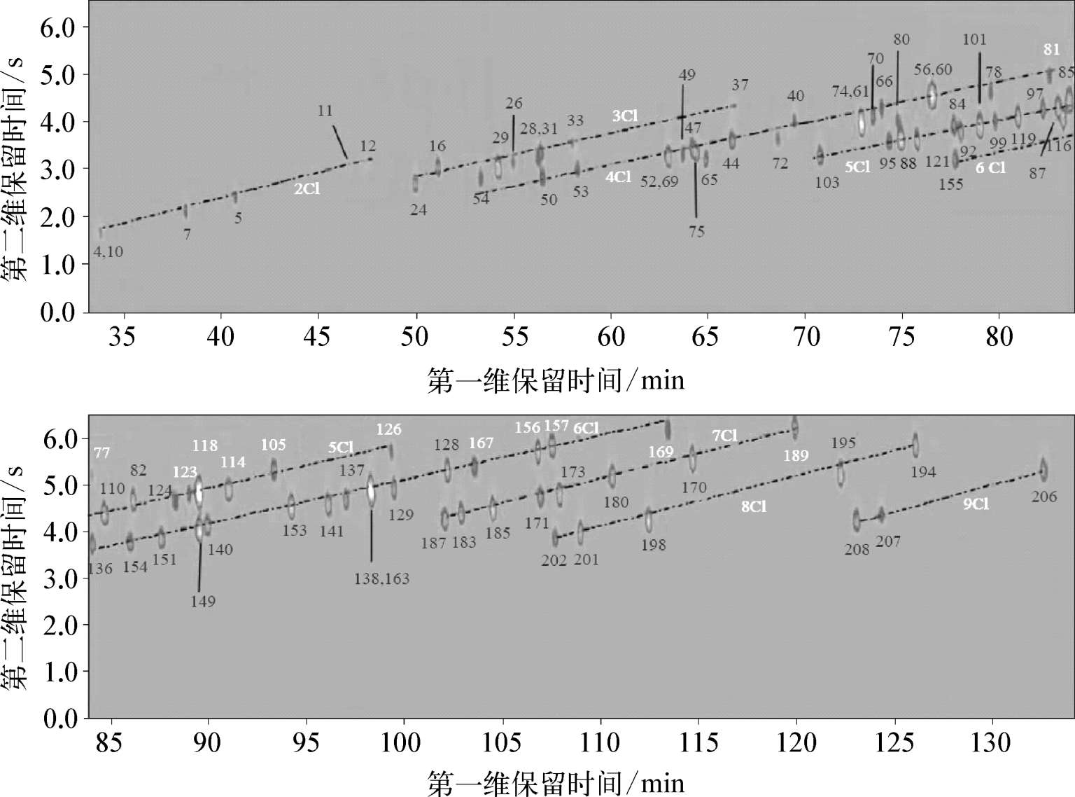 Focant等使用了一个并不完全正交的GC×GC色谱柱系统,PCBs的分离仍呈现高度结构化,可实现基于同系物邻氯代程度的污染物的识别。