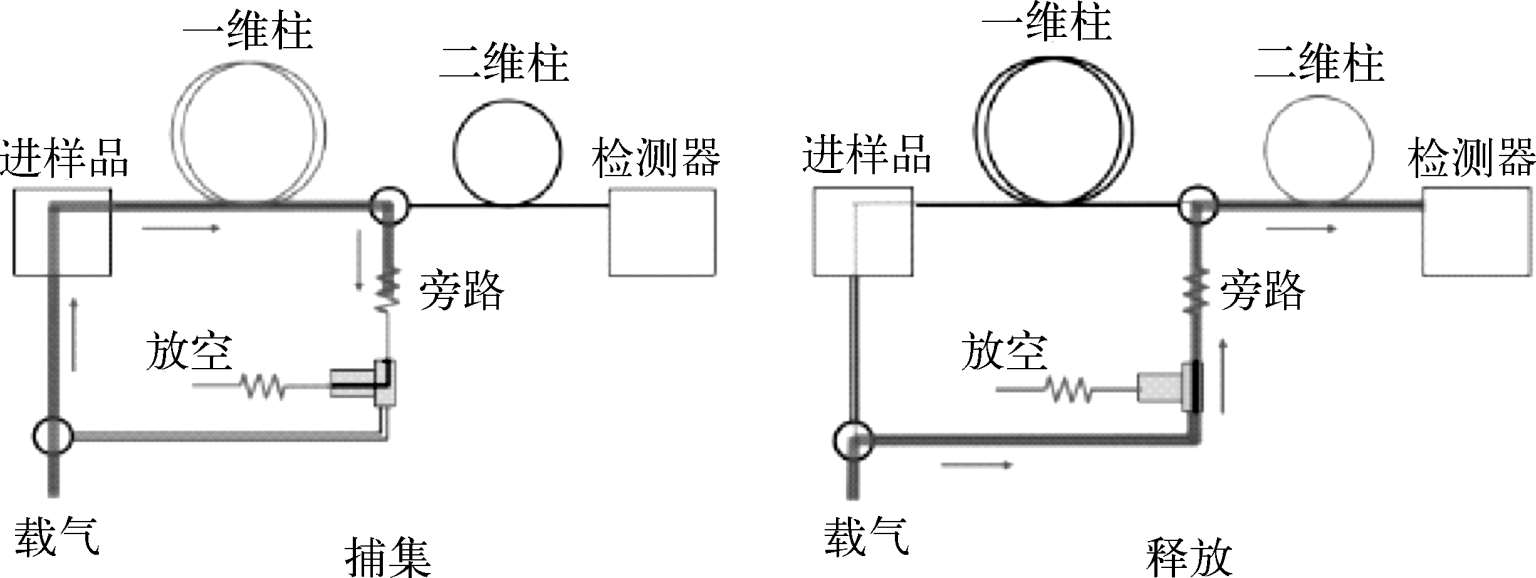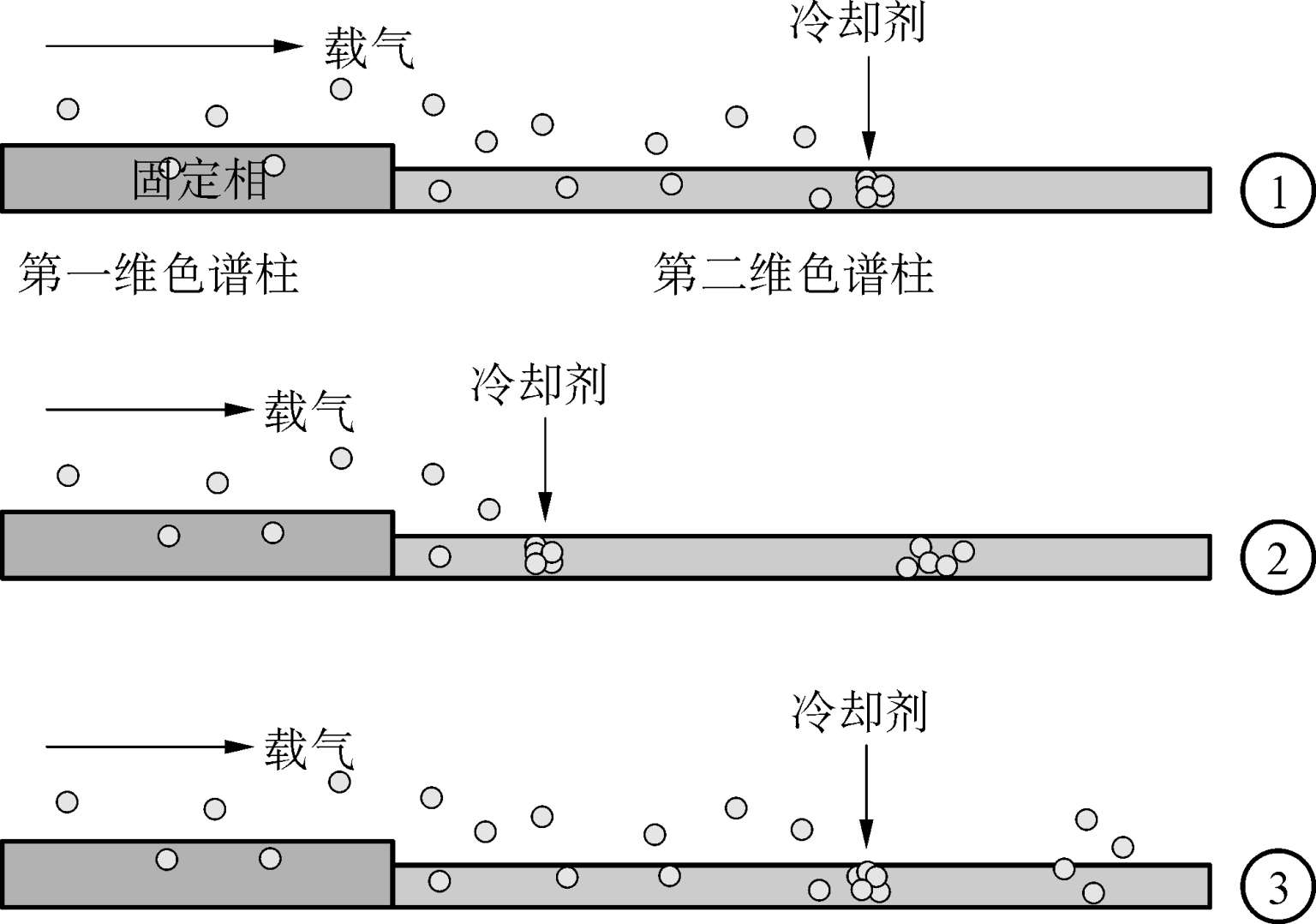 图3-7展示了这种调制器的工作原理。首先,从 1 D馏出的化合物被捕集并聚焦在 2 D色谱柱开头的低温区域内。在第二步中,通过停止降温,这一片段再次移动并以窄脉冲的形式进样到 2 D中。同时,从 1 D色谱柱中不断馏出的化合物被暂时中止以避免与进样的窄区带发生干扰。最后,这一循环再次开始。两个二氧化碳喷射口交替循环,在整个分析过程中不断重复, P M 一般在2~8 s,调制时间是上述两个步骤的时间总和。