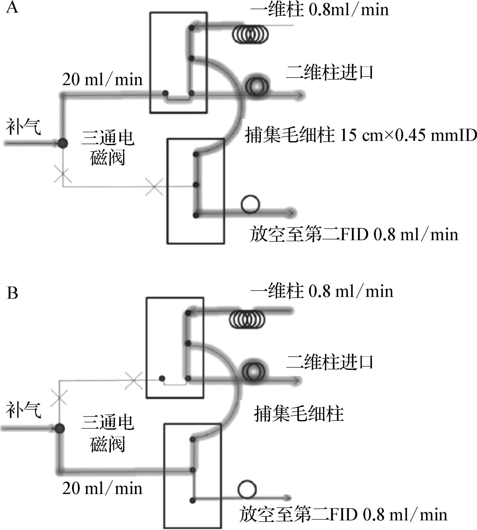 在商业化的推动下,越来越多的用户开始使用气流调制技术进行GC×GC分析,产生了很多的研究成果。但是在调制过程中,总会出现基线上升的情况,即在两次释放之间,信号并没有返回到基线。在遇到浓度大的组分时或者调制时间或流量没有匹配好的情况下,这种现象特别严重,造成了非常大的拖尾,有时甚至在 2 D上产生一条竖直的条带,直接影响了同一周期内其他物质的鉴定和分析。其原因在于在释放过程中,上游方向还是有部分物质慢慢流入定量环,造成 2 D上持续进样形成拖尾或基线上升。陶氏化学的Griffith等人发明了反向捕集/释放的气流调制技术(Reverse fill/flush,RFF)(图3-13),解决了这一难题。所谓反向,就是在样品环中捕集和释放的气流方向是相反的。而原先的气流调制技术由于捕集和释放的气流方向相同,被称为正向捕集/释放气流调制技术(Forward fill/flush,FFF)。