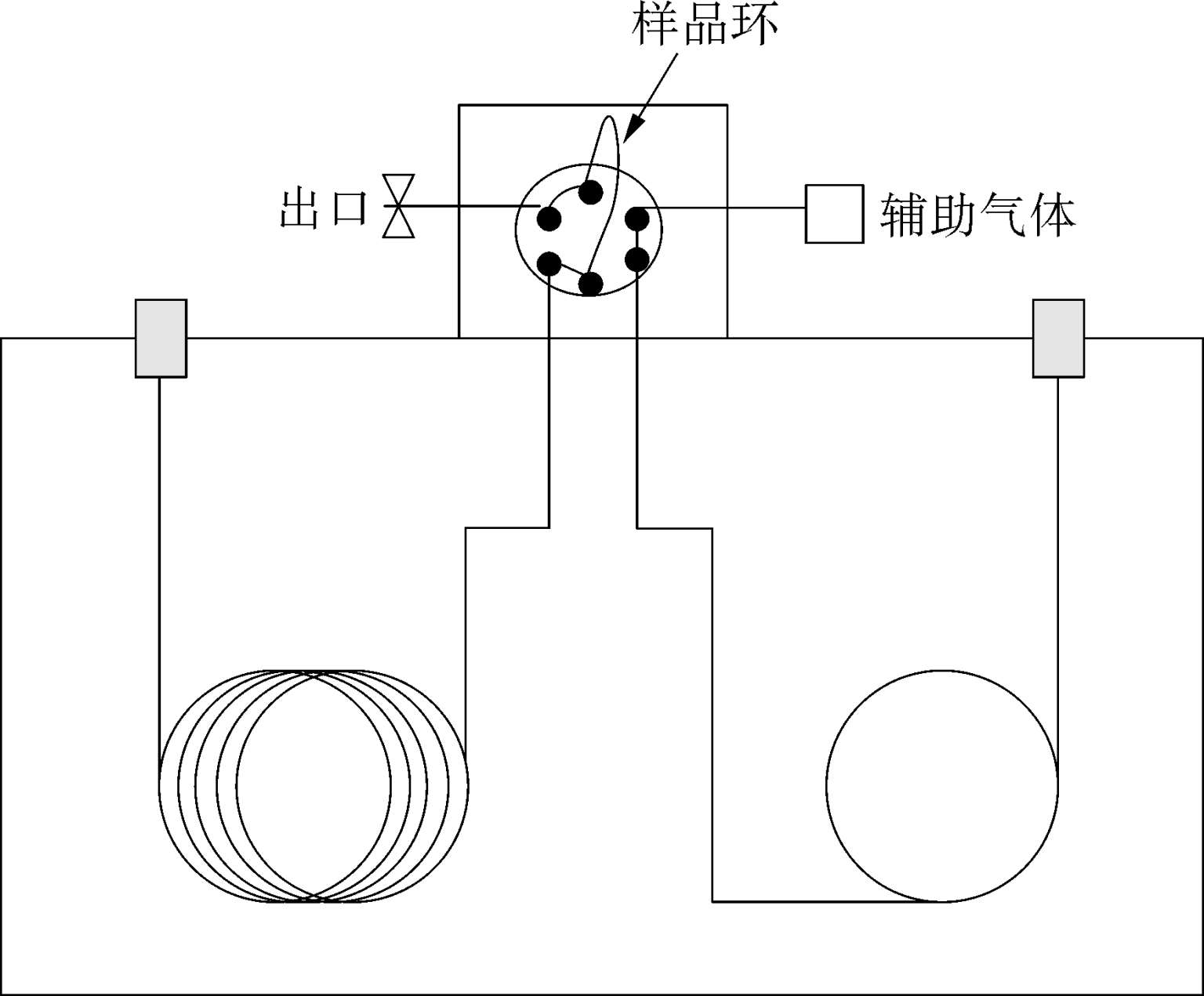 Ledford等进一步改进了Zoex的系统,设计了一个环式调制器。环式调制器是一个双级热调制器,使用热和冷气流喷射口。将一段毛细管柱绕成环,通过单个冷喷口,从而形成两级。两个冷却点之间的部分毛细管柱叫做延迟环。如图3-9所示,当冷却点形成时关闭热喷口,然后打开热喷口来抑制永久性的冷喷口,从而释放被捕集的分析物。