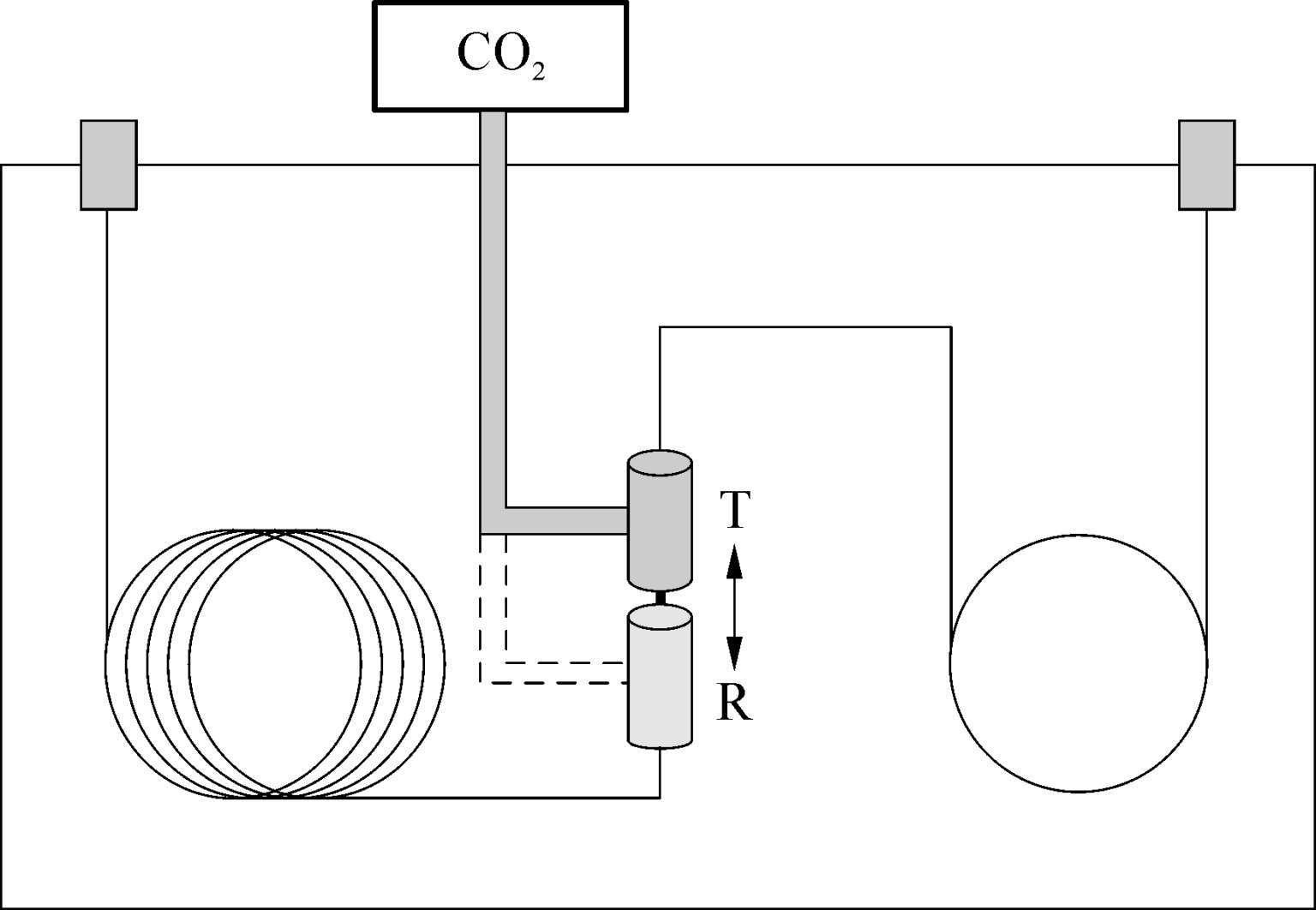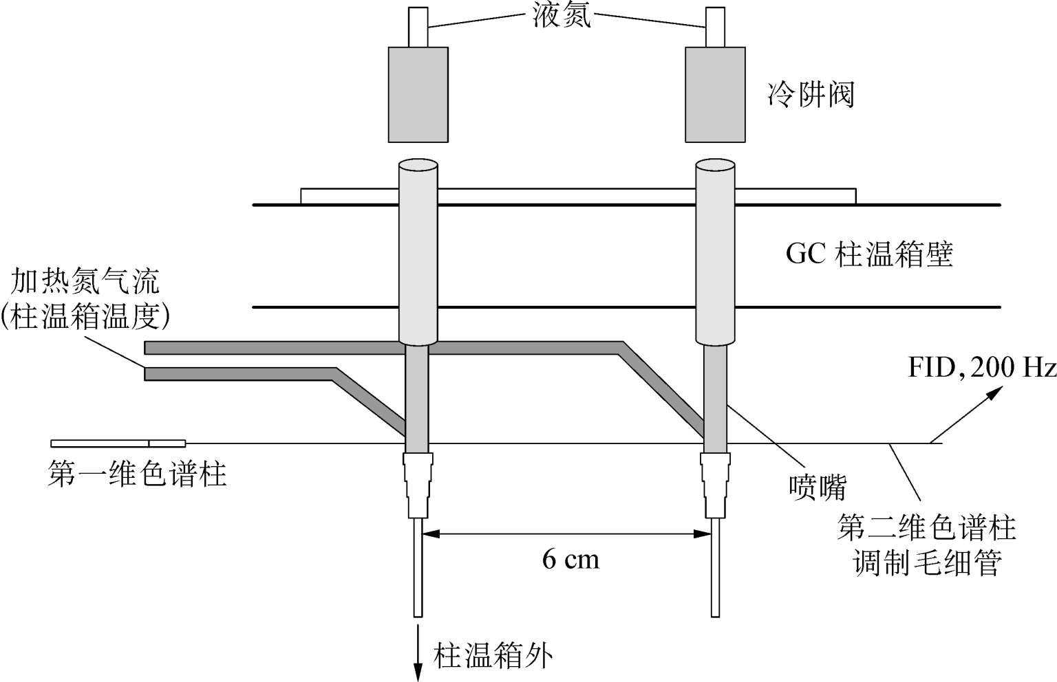 Beens等发明了另一种冷阱型调制器,同样使用液态二氧化碳聚焦分析物,但是并不需要使用机械移动的部件,这种调制器被称为双级液态二氧化碳冷阱型调制器。在实际使用中,为了捕集和聚焦每个连续的片段,对毛细管的两端直接进行交替降温,然后通过周围柱温箱的空气使其聚焦的片段再次移动。这一调制过程发生在 2 D最开始的几厘米处,通过将二氧化碳直接喷射到毛细管色谱上来降低温度。