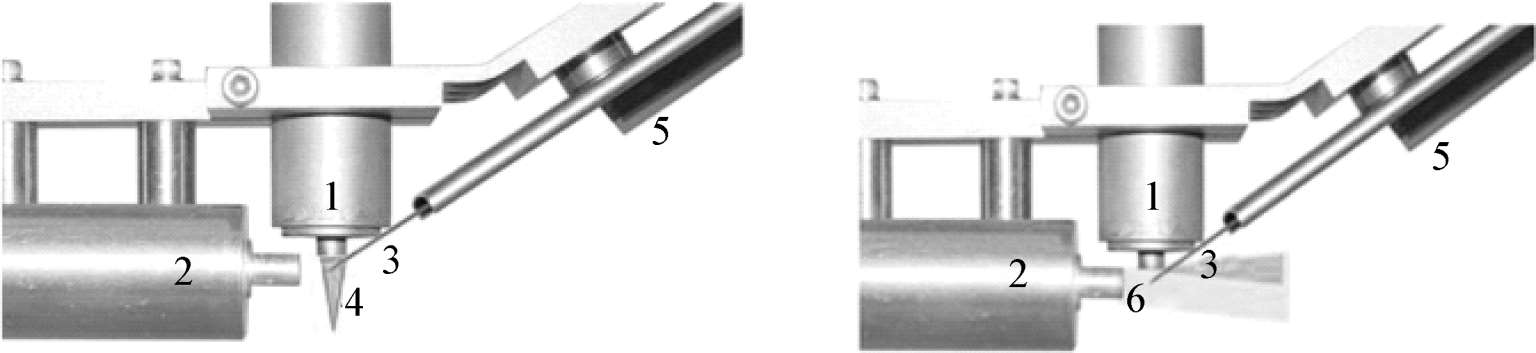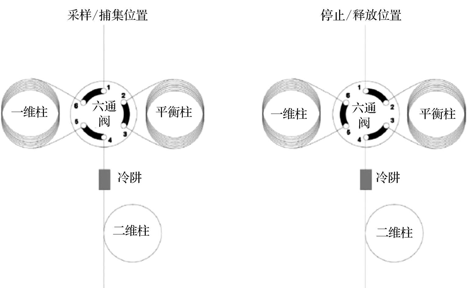 1.冷喷嘴;2.热喷嘴;3.延迟环;4.捕集区域;5. 2 D色谱柱;6.热喷嘴工作,释放分析物。