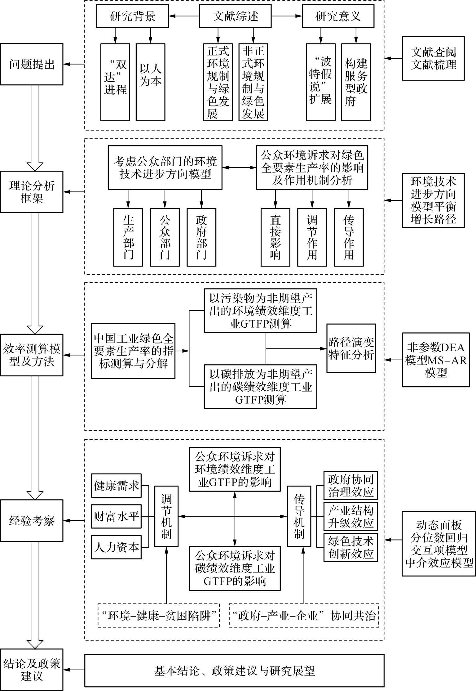 本书主要从理论和实证两个视角,立足非正式环境规制维度,探究公众环境诉求这一软约束对工业绿色全要素生产率的影响与作用机制,以期检验“波特假说”在非正式环境规制条件下的存在性;并探讨工业绿色全要素生产率在不同分位点、不同区域以及不同公众环境诉求对象的影响差异。同时,从公众的视角,探讨健康需求水平、财富水平以及人力资本水平是否会对公众环境诉求的工业GTFP提升效应产生耦合影响。此外,从政府、产业和企业三个视角厘清公众环境诉求对工业GTFP产生影响的作用路径与传导机制。基于此,本书的重点研究内容如下: