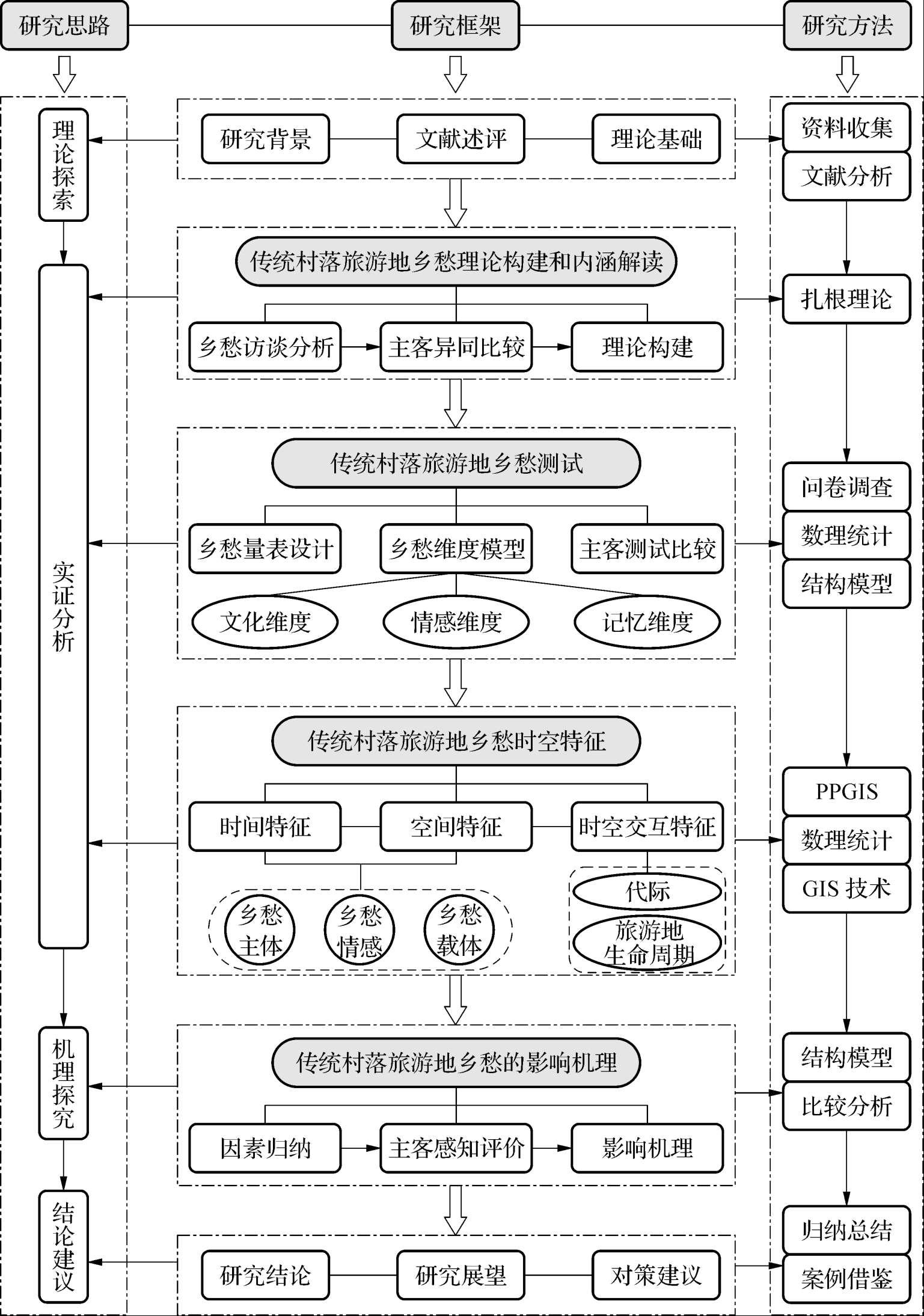在参考情感地理学、文化地理学、旅游地理学等相关学科理论的基础上,以“乡愁理论构建—乡愁测度—乡愁时空特征—乡愁影响机理”作为研究主线,以苏南传统村落为典型案例地,综合运用扎根理论、参与式地理信息系统(PPGIS)、结构方程模型、GIS空间分析等定性和定量相结合的方法,致力于主客视角下的传统村落旅游地乡愁研究,具体研究思路如下: