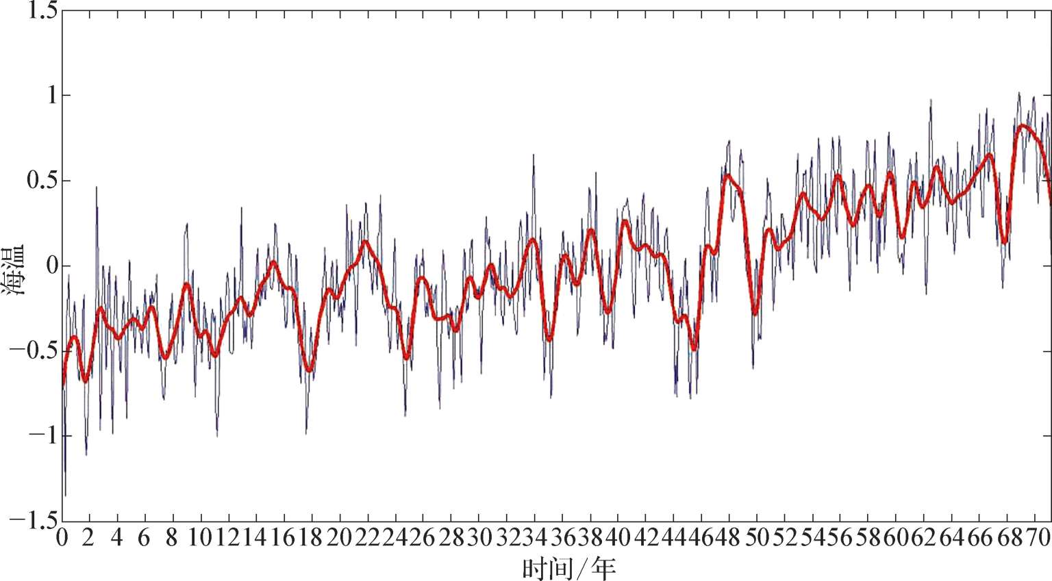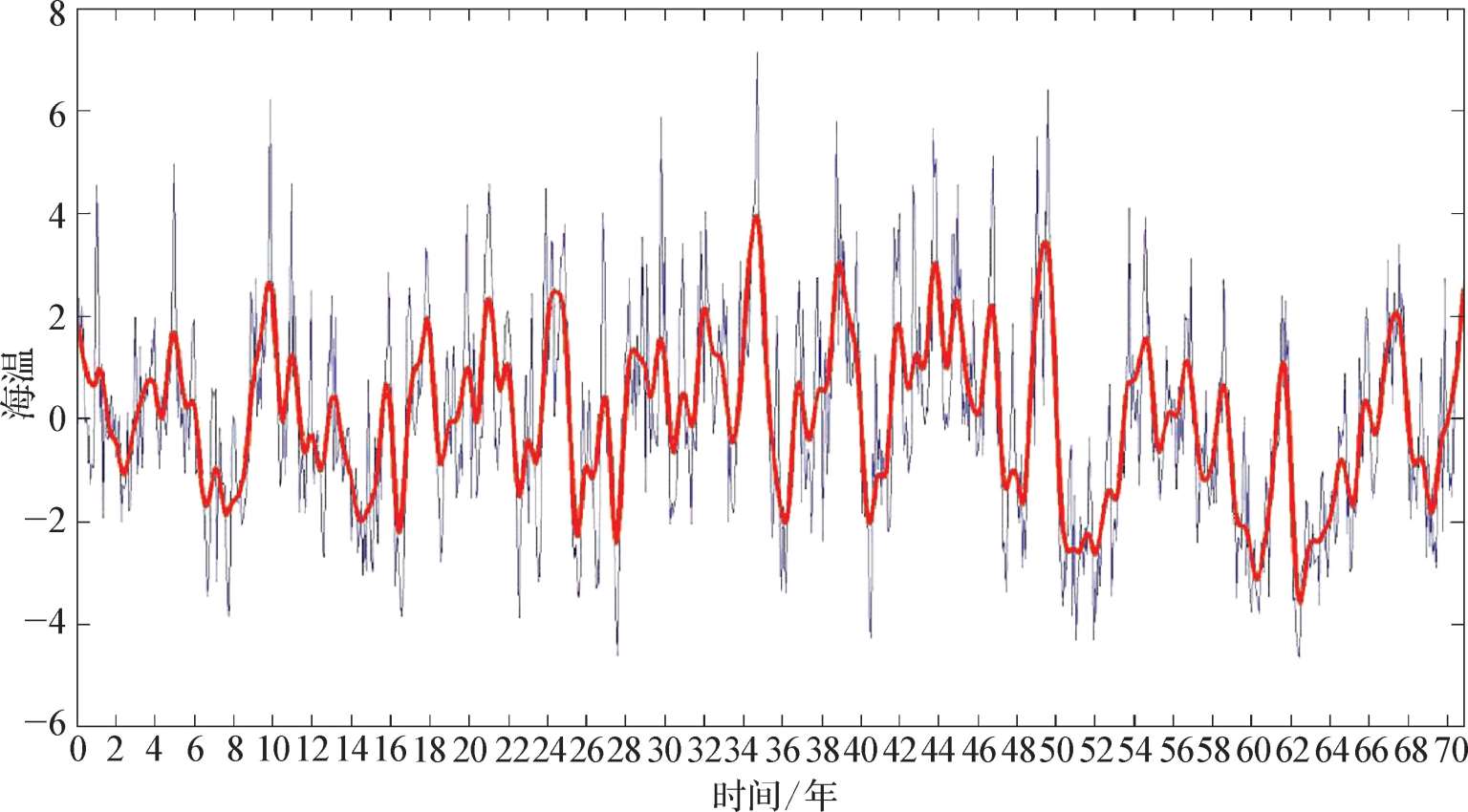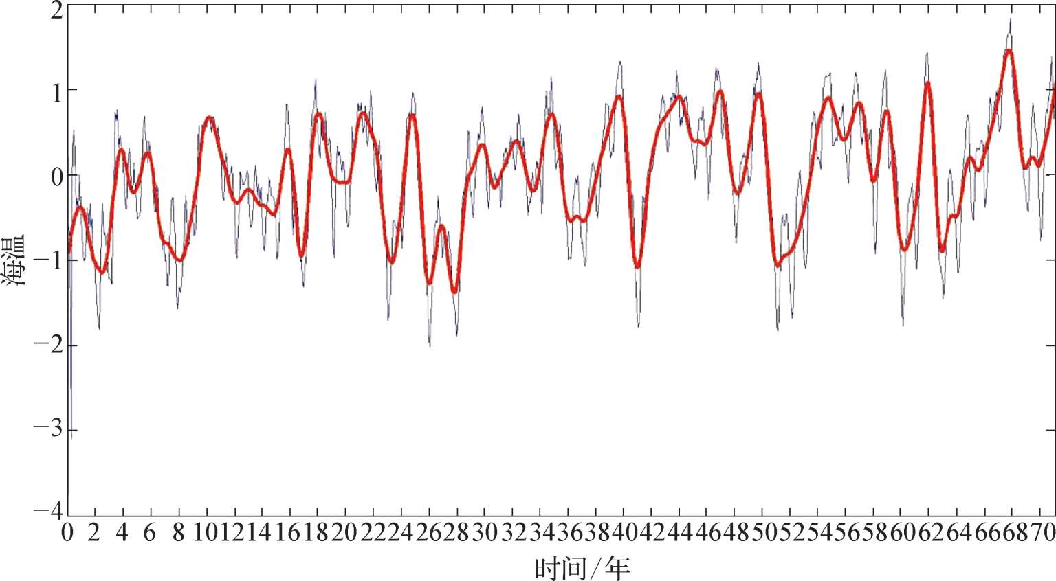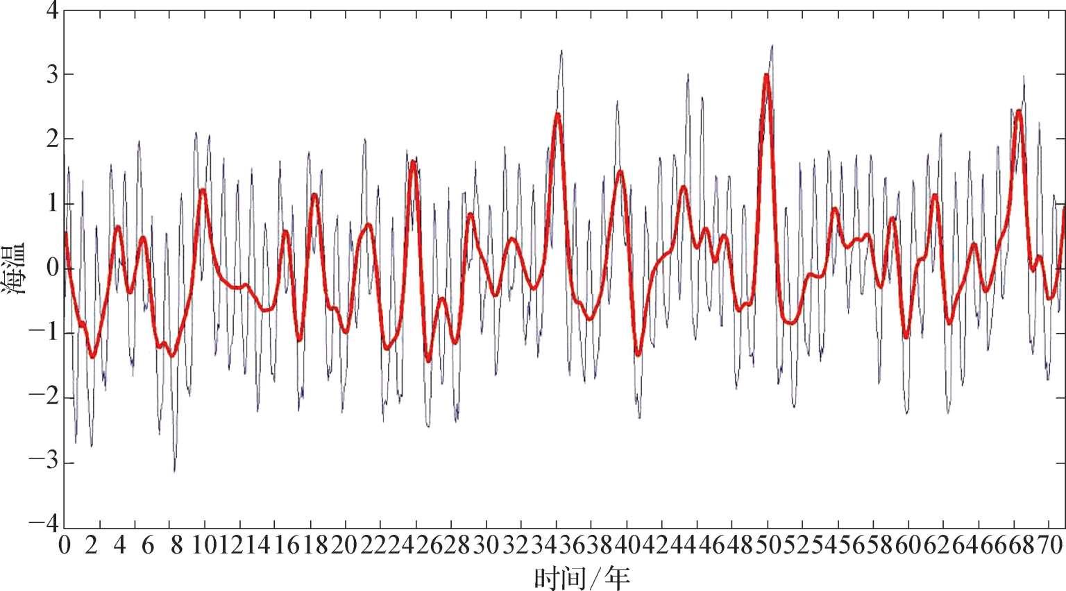 图2.8 红线表示滤波后赤道中太平洋海温指数的时间序列