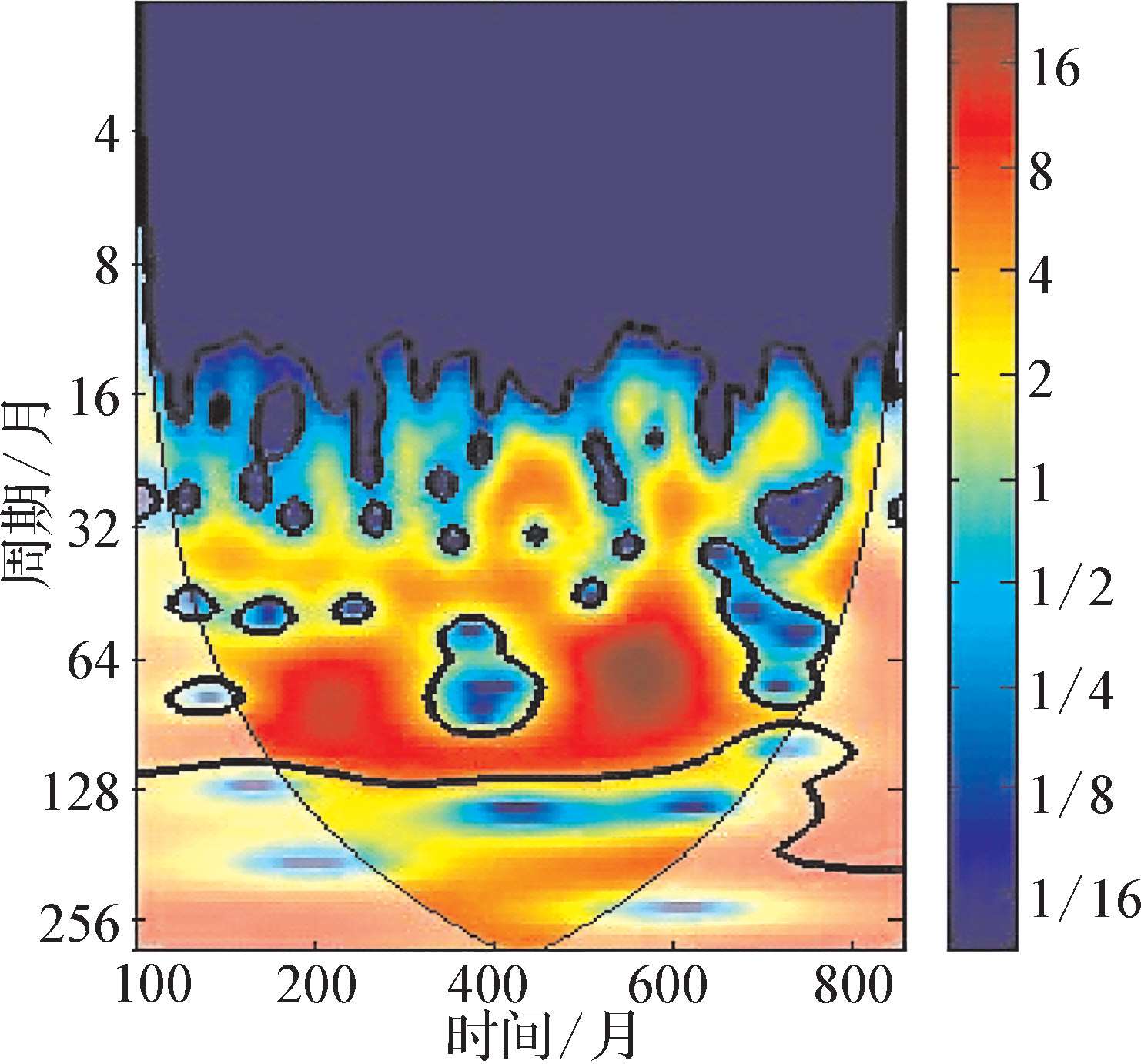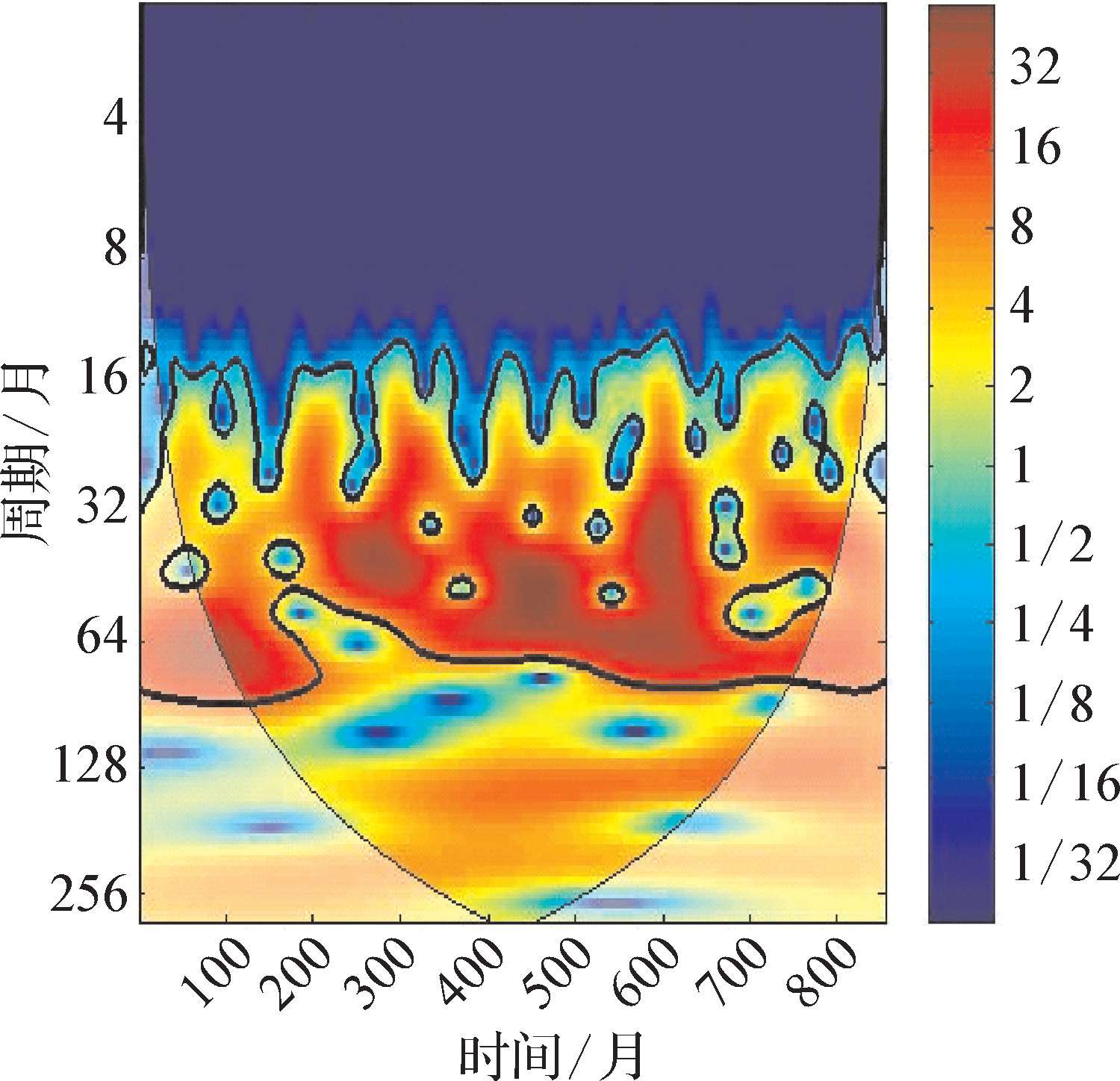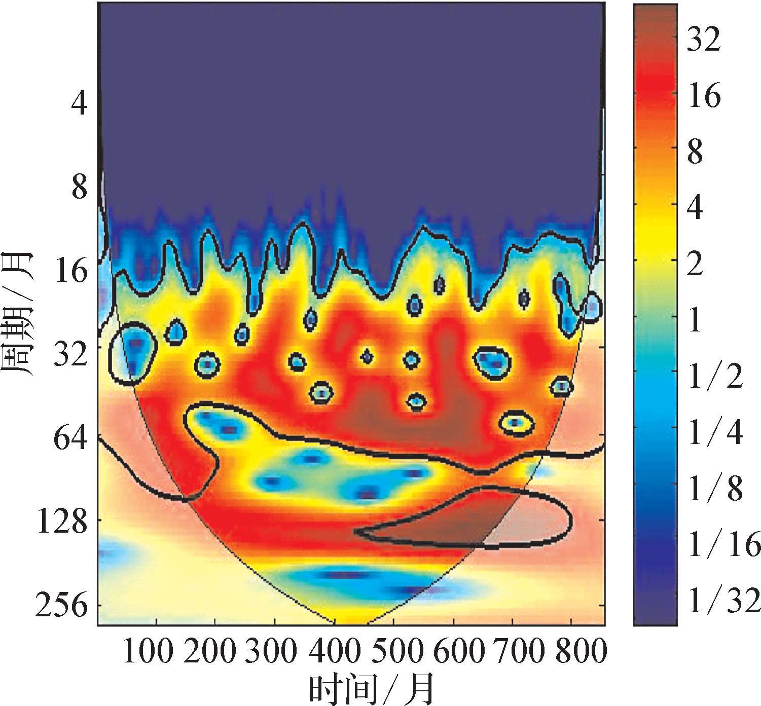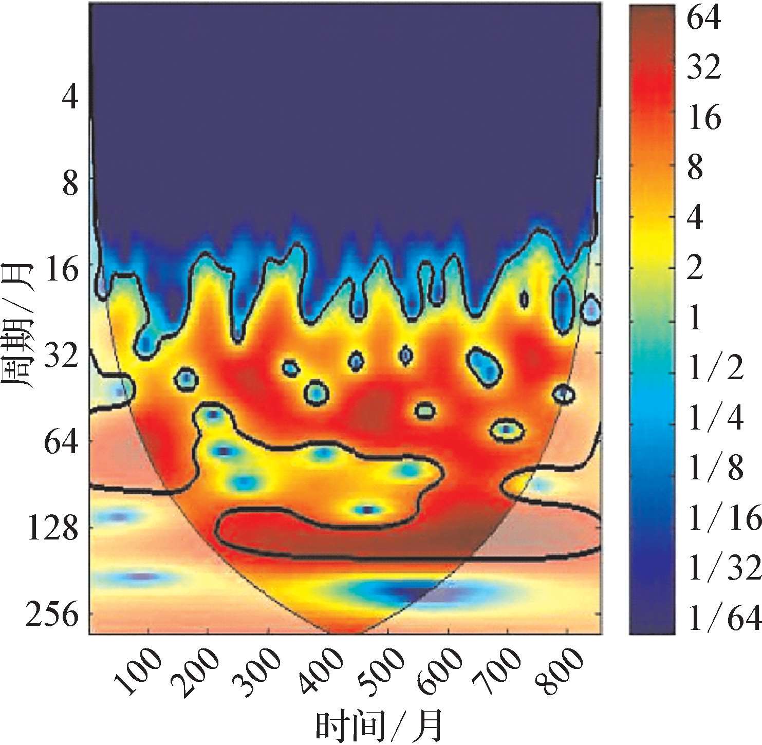 本节选用的Morlet小波是一个复数形式小波,相比于实数形式的小波,Morlet小波能够轻易地将小波变换的系数和模分离开来,其中模代表某一振荡周期所占成分的多少,位相可以用来研究时间序列的位相关系,取Morlet小波的无量纲频率等于6.0,此时该小波的Fourier周期近似等于伸缩尺度,这样便可以保证在使用Morlet小波进行连续小波变换时,时域和频域分辨能力达到最佳平衡。