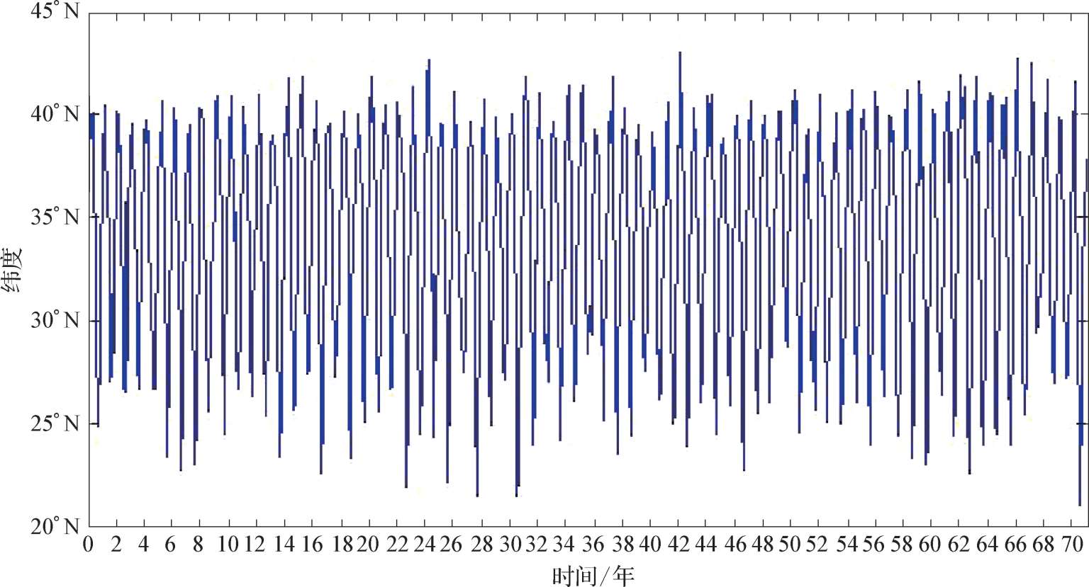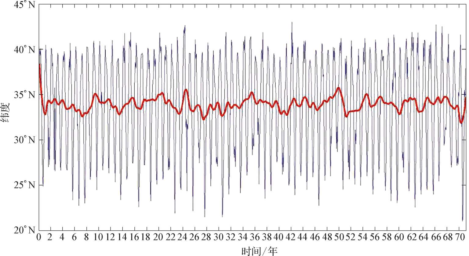 为了描述和刻画西太副高的年际变率,首先画出重建的西太副高的强度指数和脊线指数的时间序列图,如图2.1和2.2所示,由于此图中不但包含了西太副高的年际变率,同时还有短期季节内的异常变化,导致图中西太副高特征指数的变化杂乱无章,不能很好地看出西太副高的年际变化特征。因此,再次对这两个时间序列进行低通滤波,滤去季节内的变化,只保留西太副高2—8年内的年际变化,如图2.3和2.4所示。在1948—2019年这71年间,西太副高的强度指数和脊线指数在年际尺度上有35个峰值,对应了西太副高的35次异常活动。由此可看出西太副高大致存在两年左右的异常变化周期。最后,对滤波后特征指数的时间序列进行功率谱分析,得到如图2.5和2.6所示的强度指数以及脊线指数的功率谱值,结合图2.3和2.5的特征可得出,西太副高的强度指数存在明显的准2—3年和准5年两个年际振荡周期;同理,结合图2.4和2.6的特征得到西太副高的脊线指数也存在明显的准2—3年和准5年两个年际振荡周期,并且都通过了显著性水平的红色噪声检验。通过对西太副高强度指数和脊线指数的小波功率谱分析,综合其变化特征,可以得出西太副高存在着准2—3年和准5年的年际变率。