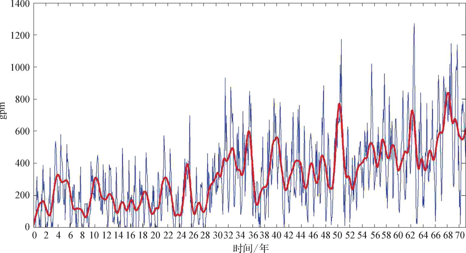 图2.4 红线表示滤波后脊线指数的时间序列图
