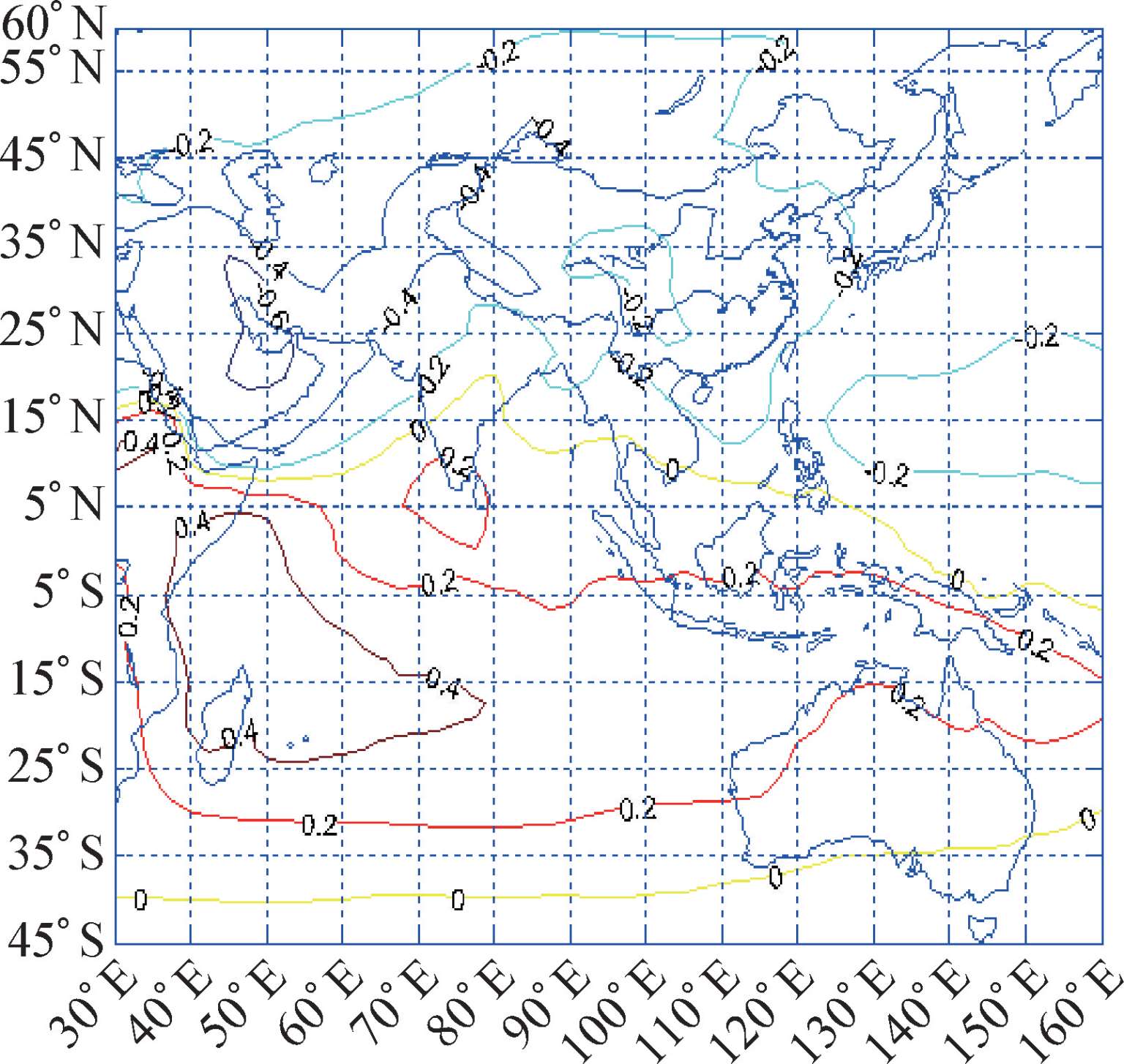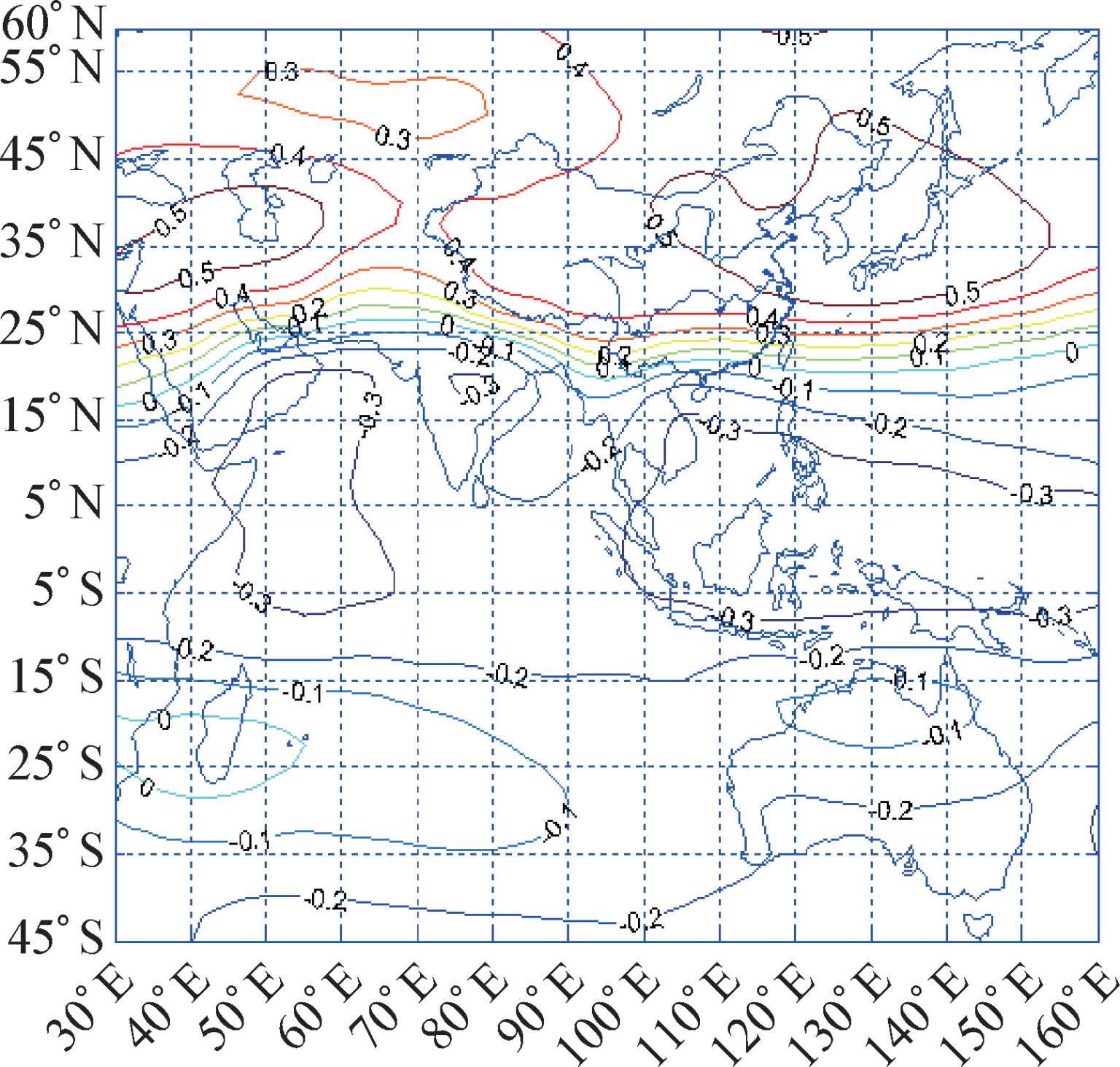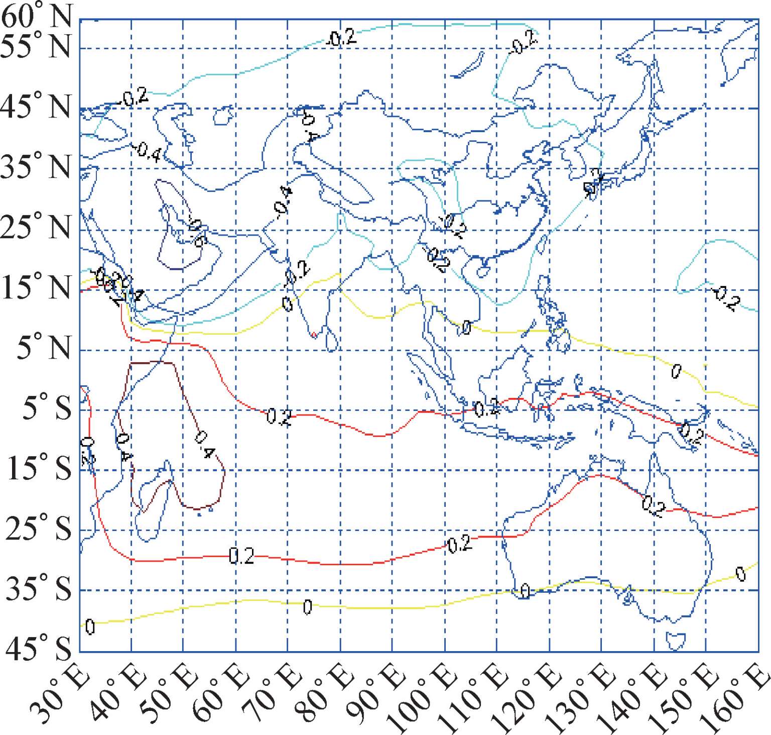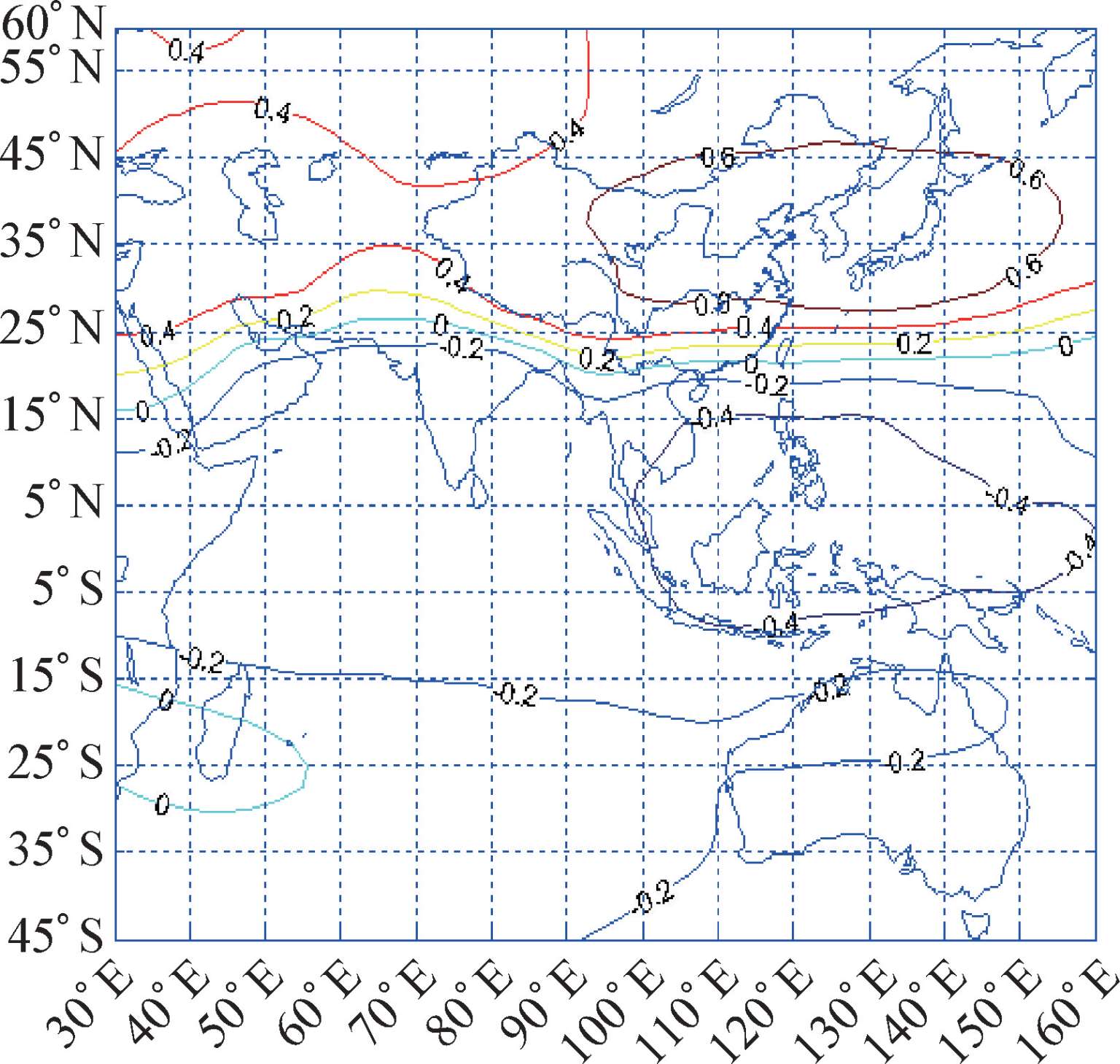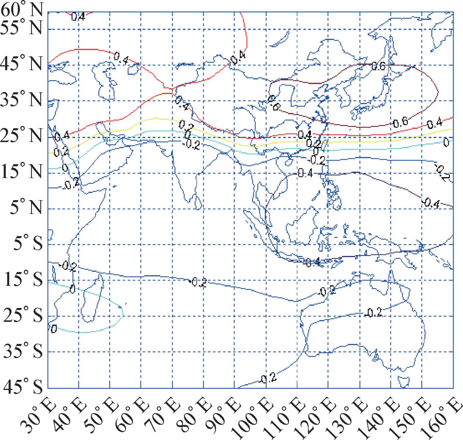 分别计算副高脊线指数与500 hPa高度场、海平面气压场、850 hPa纬向风场、850 hPa经向风场、200 hPa纬向风场的时滞1天、3天、5天格点相关(如图3.17 ~图3.31所示),从格点相关图中可以看出,在500 hPa高度场[25° ~45°N,110° ~160°E]、850 hPa纬向风场[5° ~ 25°N,30° ~80°E]、850 hPa经向风场[5°S ~ 25°N,40° ~ 70°E]、海平面气压场[15° ~ 35°N,30° ~60°N]、200 hPa纬向风场[5° ~35°N,30° ~160°N]范围内的格点相关系数比较显著。将这些区域作为关键区,计算关键区域的格点平均值,并将其作为影响副高脊线变化的影响因子。然后,计算副高脊线指数与亚洲季风系统各成员指标和这些影响因子时滞1天、3天、5天的相关系数,如表3.5所示。相关系数分布如图3.32、图3.33和图3.34所示。