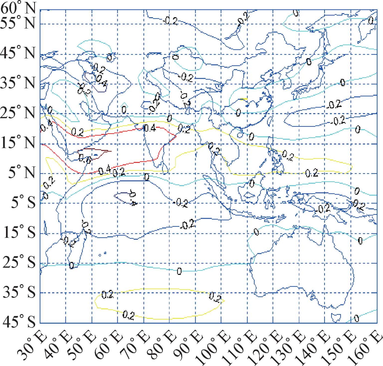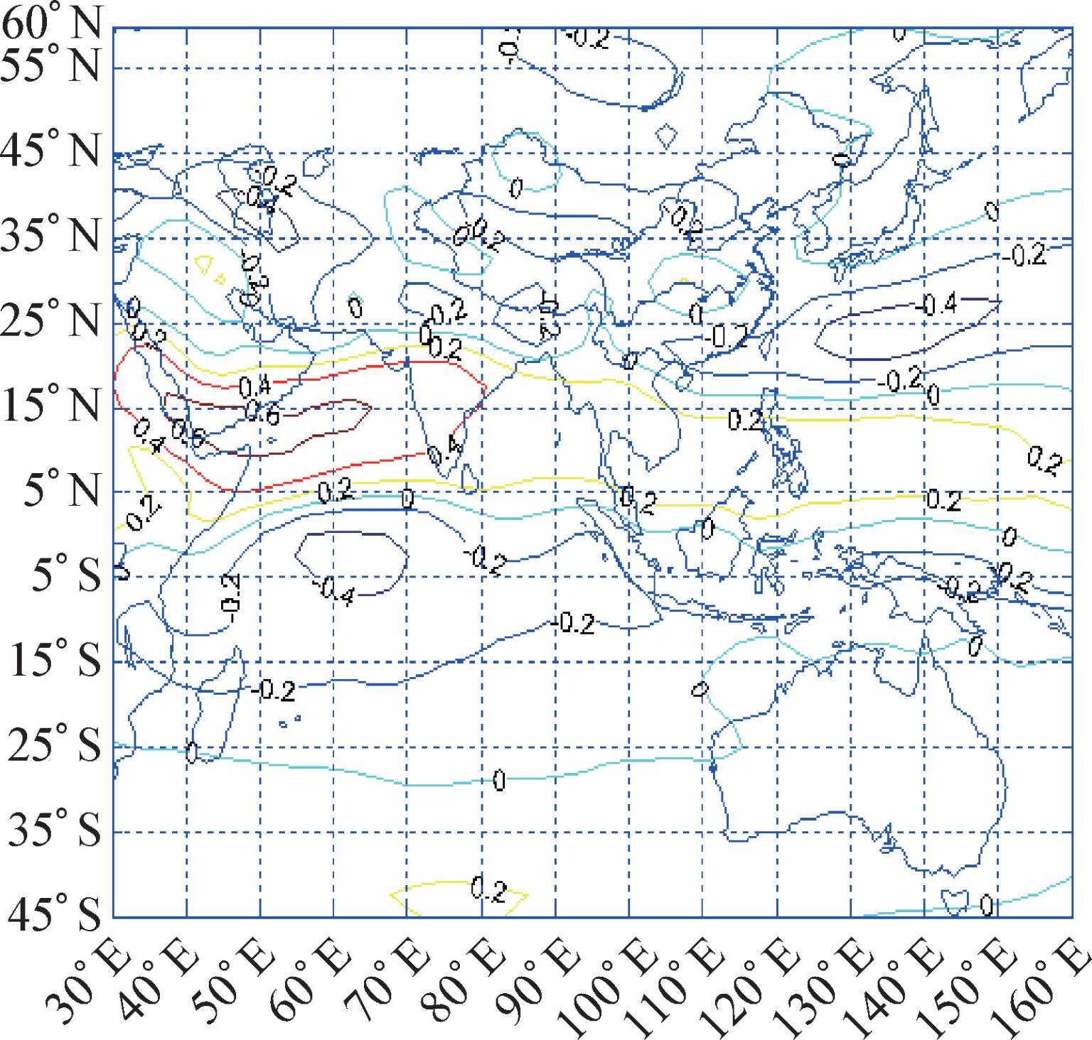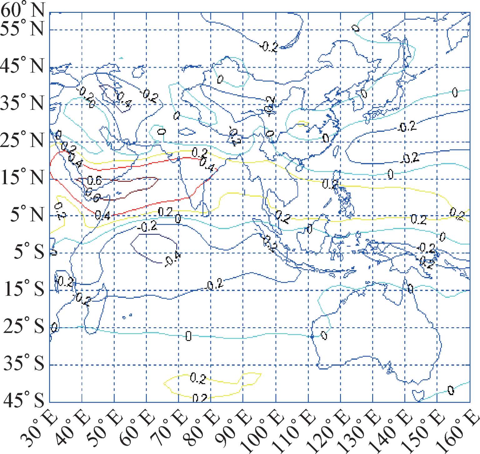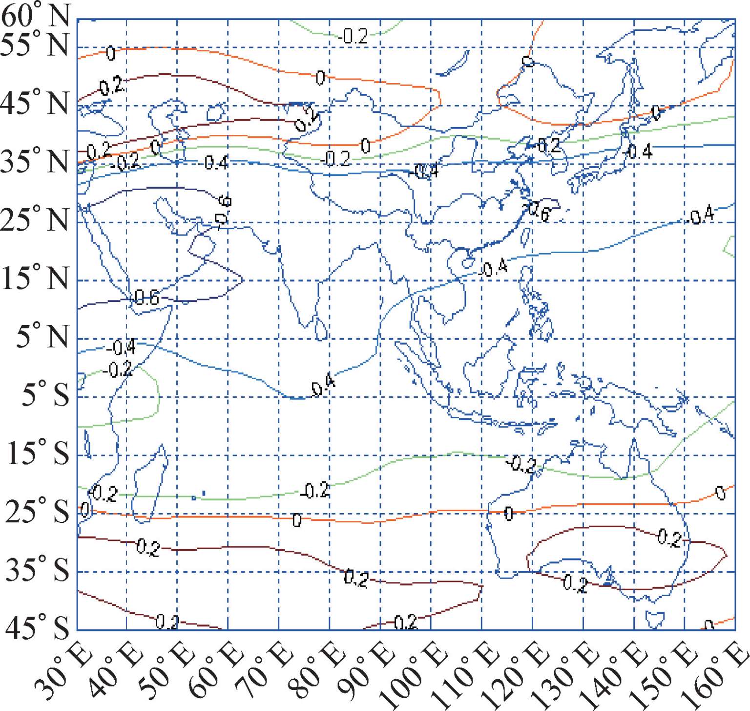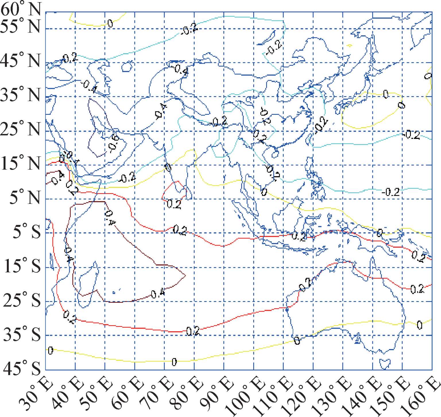 分别计算副高脊线指数与500 hPa高度场、海平面气压场、850 hPa纬向风场、850 hPa经向风场、200 hPa纬向风场的时滞1天、3天、5天格点相关(如图3.17 ~图3.31所示),从格点相关图中可以看出,在500 hPa高度场[25° ~45°N,110° ~160°E]、850 hPa纬向风场[5° ~ 25°N,30° ~80°E]、850 hPa经向风场[5°S ~ 25°N,40° ~ 70°E]、海平面气压场[15° ~ 35°N,30° ~60°N]、200 hPa纬向风场[5° ~35°N,30° ~160°N]范围内的格点相关系数比较显著。将这些区域作为关键区,计算关键区域的格点平均值,并将其作为影响副高脊线变化的影响因子。然后,计算副高脊线指数与亚洲季风系统各成员指标和这些影响因子时滞1天、3天、5天的相关系数,如表3.5所示。相关系数分布如图3.32、图3.33和图3.34所示。