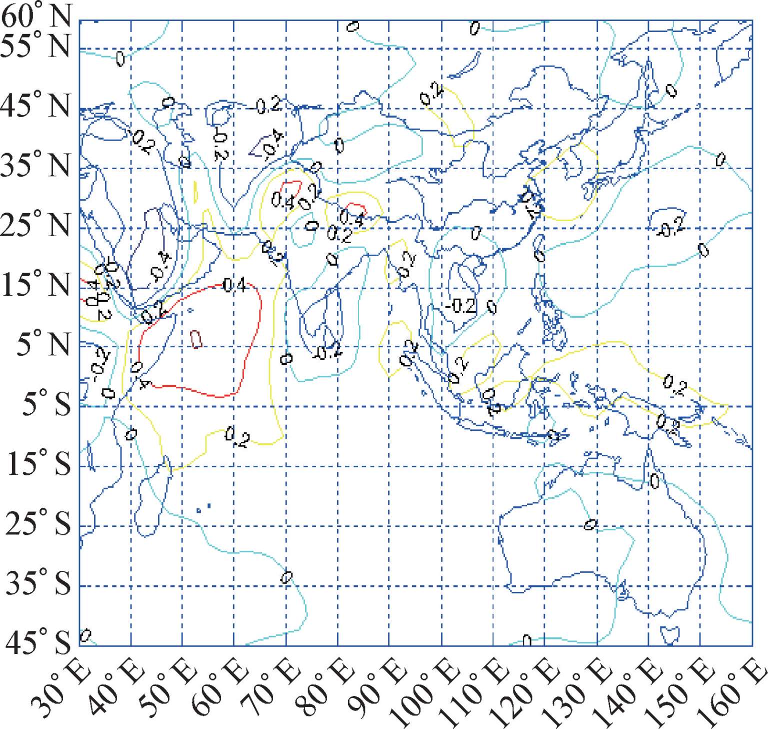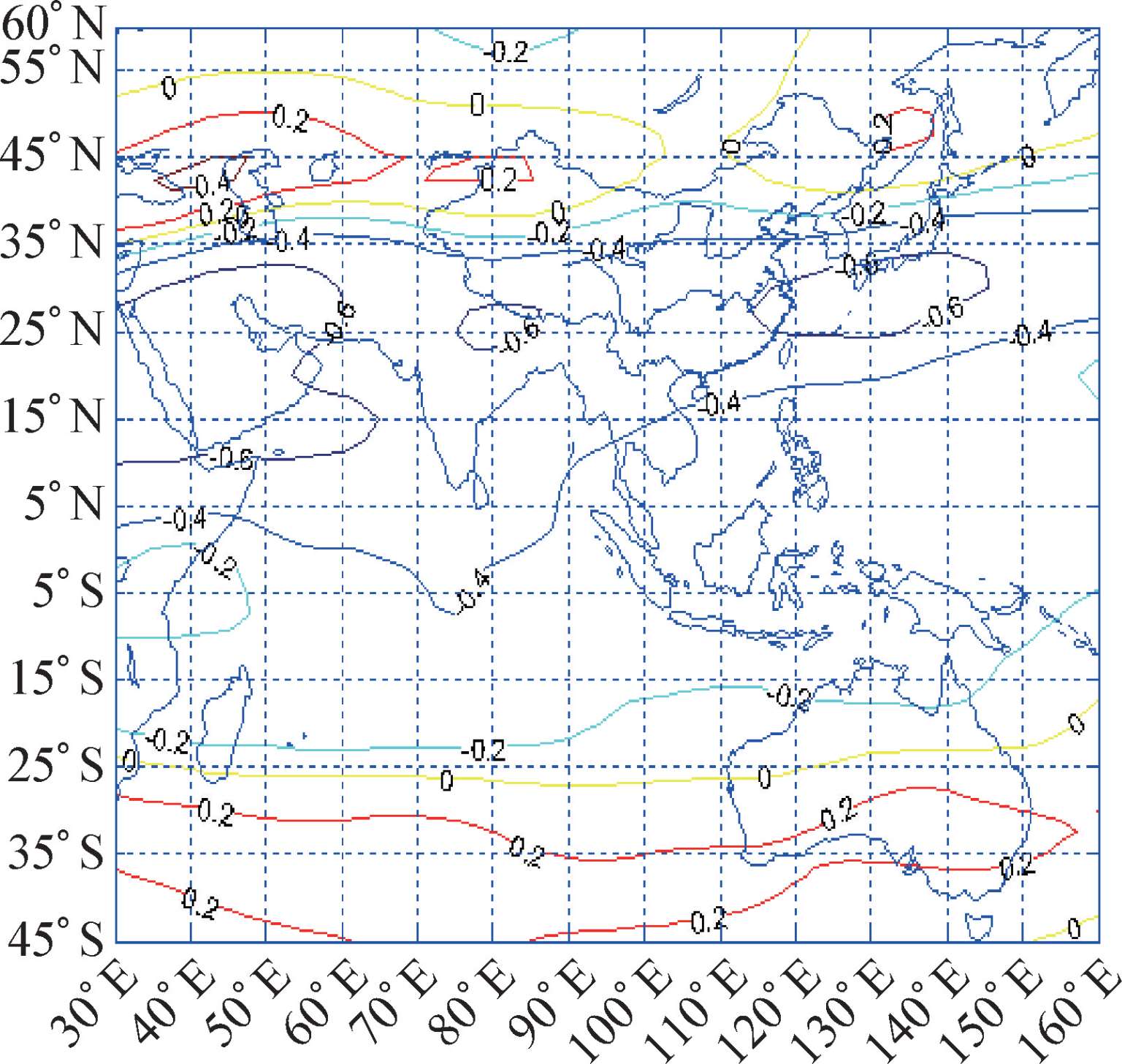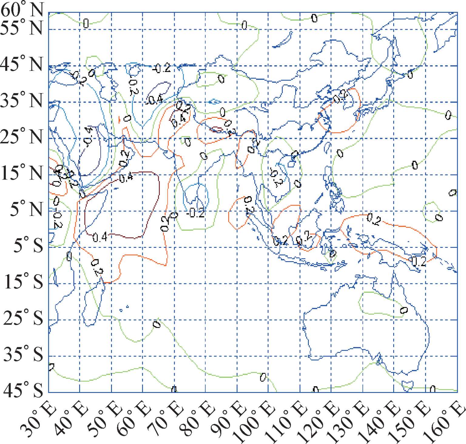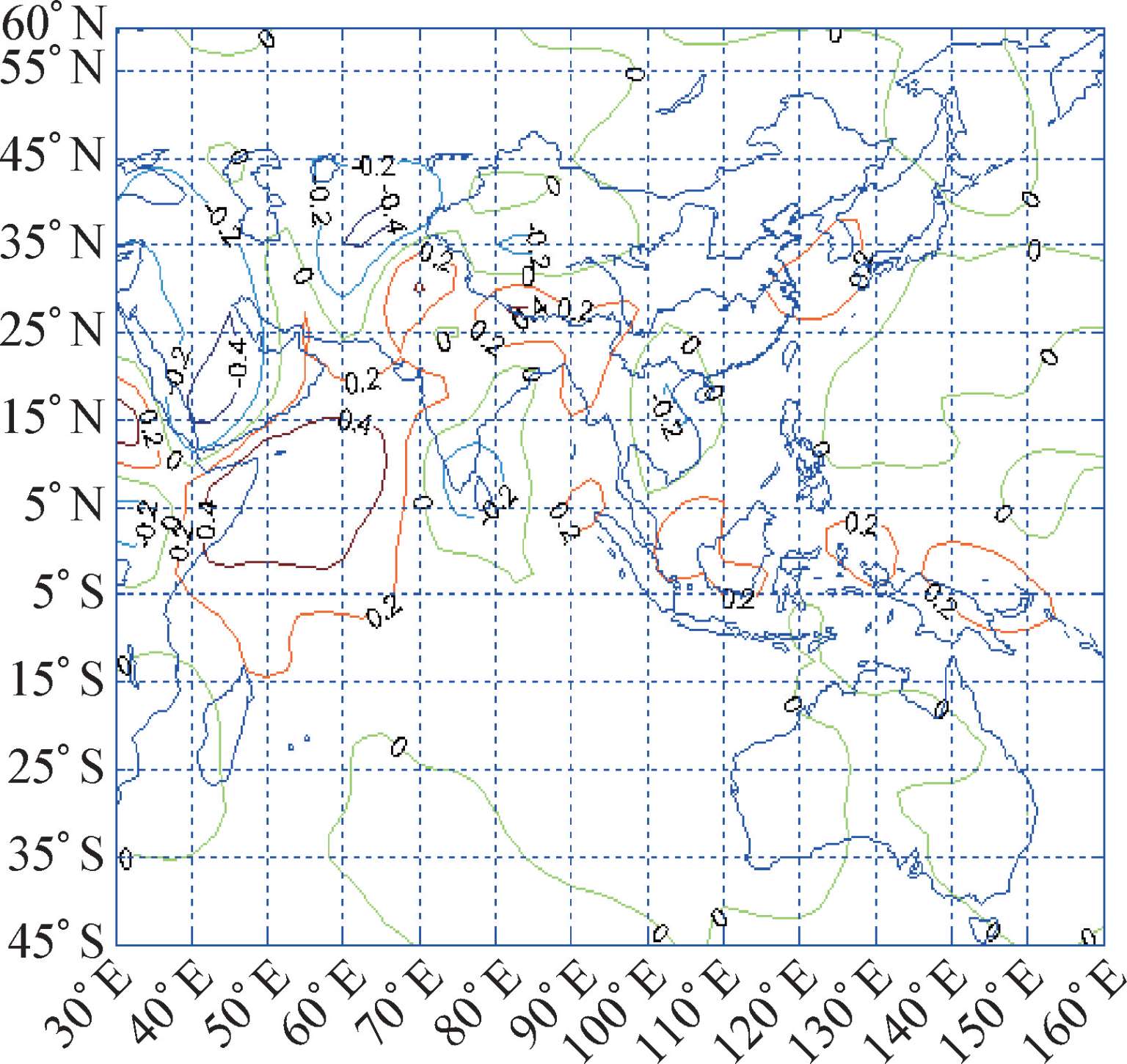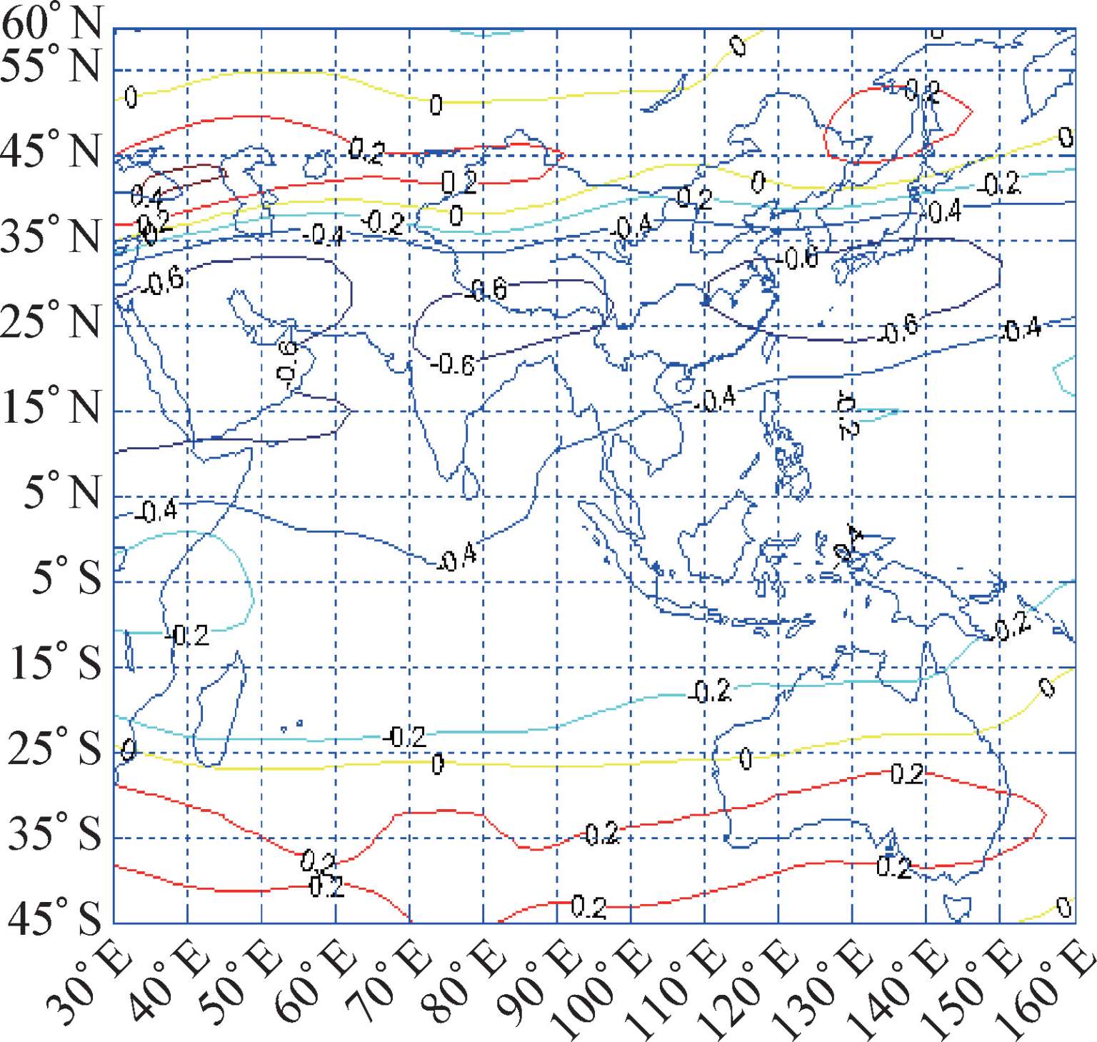 分别计算副高脊线指数与500 hPa高度场、海平面气压场、850 hPa纬向风场、850 hPa经向风场、200 hPa纬向风场的时滞1天、3天、5天格点相关(如图3.17 ~图3.31所示),从格点相关图中可以看出,在500 hPa高度场[25° ~45°N,110° ~160°E]、850 hPa纬向风场[5° ~ 25°N,30° ~80°E]、850 hPa经向风场[5°S ~ 25°N,40° ~ 70°E]、海平面气压场[15° ~ 35°N,30° ~60°N]、200 hPa纬向风场[5° ~35°N,30° ~160°N]范围内的格点相关系数比较显著。将这些区域作为关键区,计算关键区域的格点平均值,并将其作为影响副高脊线变化的影响因子。然后,计算副高脊线指数与亚洲季风系统各成员指标和这些影响因子时滞1天、3天、5天的相关系数,如表3.5所示。相关系数分布如图3.32、图3.33和图3.34所示。