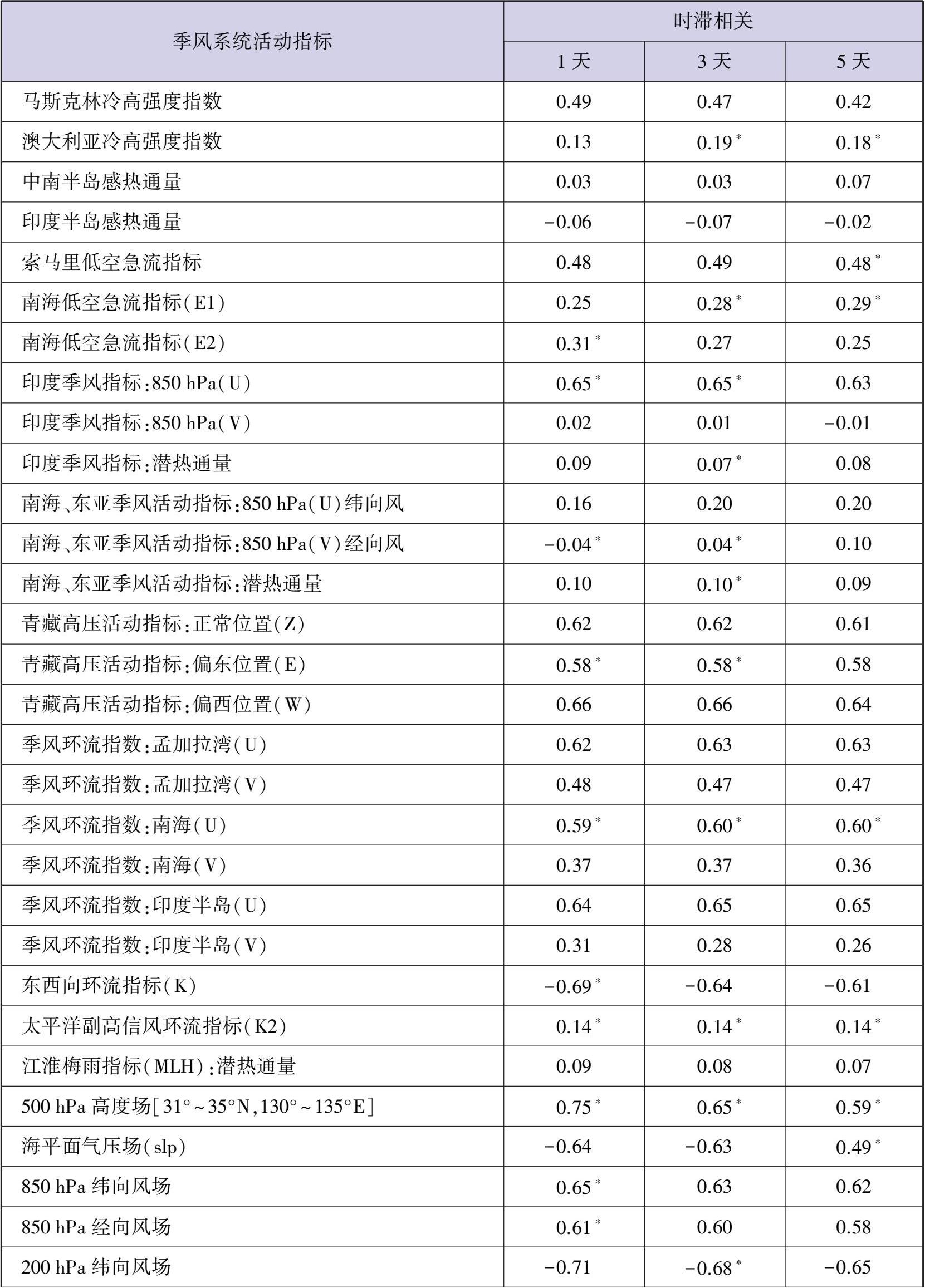 值筛选出最优子集(即表3.6、表3.7和表3.8中带星号的子集)。时滞1天的最优子集包括南海低空急流指标、印度季风指标(850 hPa纬向风)、南海、东亚季风活动指标:850 hPa经向风、青藏高压活动指标:偏东位置、南海纬向季风环流、东西向环流指标、太平洋副高信风环流指标、500 hPa副高位势场、850 hPa纬向风场、850 hPa经向风场、副高面积指数、副高强度指数、北界位置、副高西脊点指数。时滞3天的最优子集包括澳大利亚冷高强度指数、南海低空急流指标、850 hPa印度纬向季风经向环流、印度季风潜热通量、青藏高压活动指标:偏东位置、南海纬向季风环流、太平洋副高信风环流指标、500 hPa副高位势场、200 hPa纬向风场、副高强度指数、北界位置、副高西脊点指数。时滞5天的最优子集包括澳大利亚冷高强度指数、索马里低空急流指标、南海低空急流指标、南海纬向季风环流、太平洋副高信风环流指标、500 hPa副高位势场、副高面积指数、副高西脊点指数。