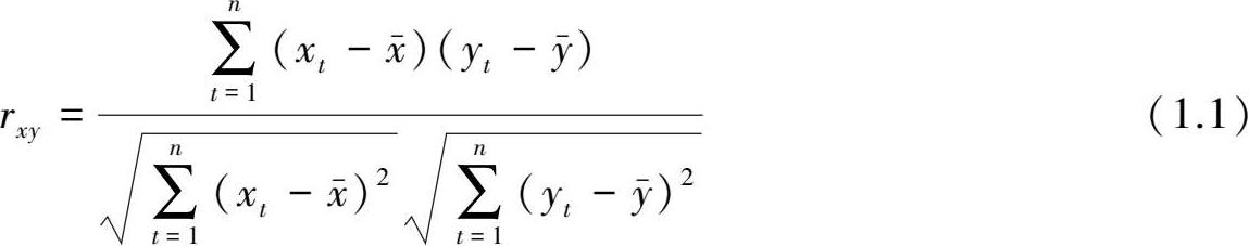 相关系数 r xy 是衡量任意两个时间序列之间关系密切程度的量。假设两个时间序列 x 、 y ,其样本长度均为 n ,那么计算相关系数的公式为: