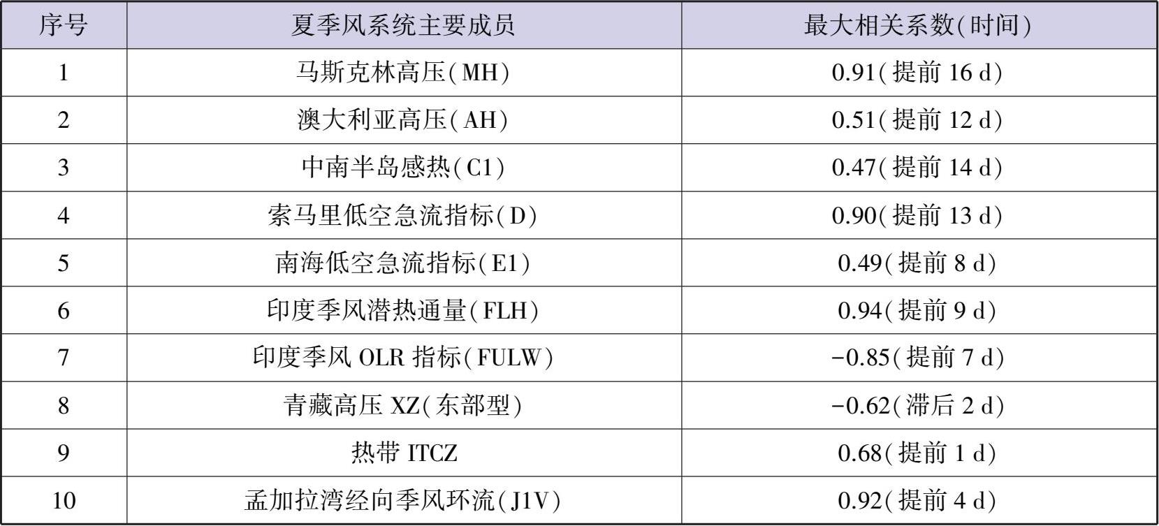 与第2节的方法一样,将2010年5—10月的副高脊线指数和前面选取的相应时间段夏季风系统成员中的10个因子进行时滞相关分析,分析的结果如表1.2所示。