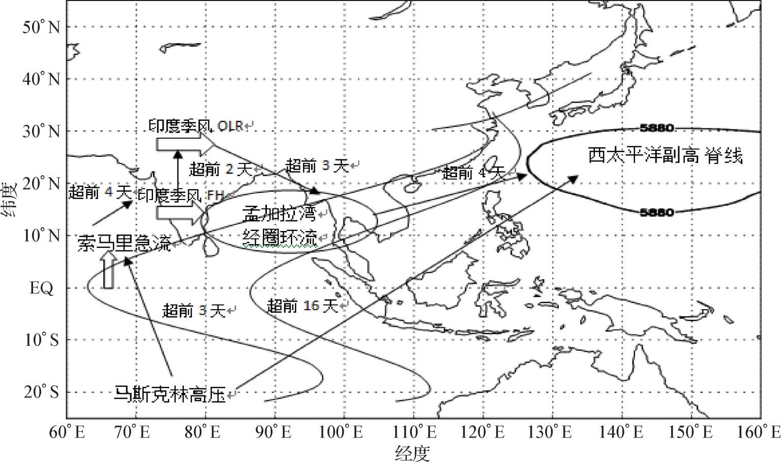 从表中可以看出,相关性较好的五个因子分别是马斯克林高压(MH),索马里低空急流指标(D),印度季风潜热通量(FLH),印度季风OLR指标(FULW)和孟加拉湾经向季风环流(J1V),相关系数均达0.85以上。说明副高脊线指数与这五个因子之间的相关性显著。以马斯克林高压为例,从6月下旬到8月下旬,马斯克林高压(简称马高)有5~6次加强和减弱过程,即呈现显著的准双周期振荡现象,与副高中期活动周期一致。特别是6月中下旬有次极为明显的加强过程,这与副高最强的一次北跳存在密切关联。其他4个因子与副高南北位置变化的关系密切与前人做的研究也基本相符。在此基础上,也可以抽取出1998年西太副高脊线与季风系统基本的关联结构相互影响与时延变化的天气学框架,如图1.2所示。