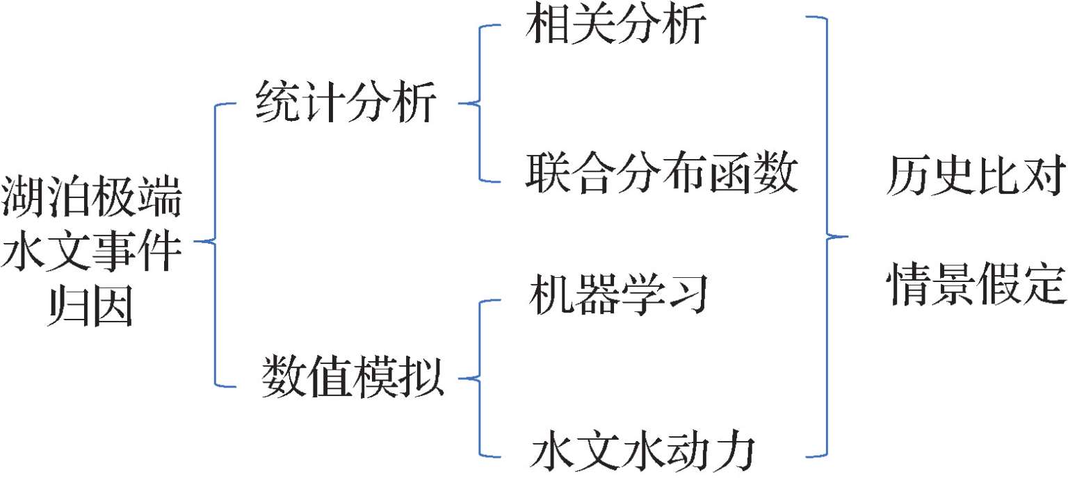 湖泊极端水文事件的产生是流域入/出湖水文过程和湖泊自身水量收支过程共同作用的结果(Carter et al.,2018;Ghale et al.,2018;Lei et al.,2019;Satge et al.,2017;Sun et al.,2013;Zhang et al.,2014)。流域水文过程受到气候、土地利用/覆被变化和社会经济发展用水的综合影响,湖泊本身作为陆—气交互作用的特殊界面,水热条件(降水和蒸发)剧烈波动,加之湖区人类活动的影响,使得湖泊极端水文事件的成因异常复杂。常用的湖泊极端事件成因的识别方法可分为统计分析法和数值模拟法,其中统计分析法主要用于湖泊极端水文事件成因的定性识别,包括相关分析法和联合分布函数法(Assani et al.,2016;Biron et al.,2014;Ghale et al.,2018;Tian et al.,2014;Zhang D et al.,2017;郭华等,2012;李景保等,2011);数值模拟法主要用于湖泊极端水文事件成因的定量识别,包括机器学习法和水文水动力方法(Liu et al.,2018;Myronidis et al.,2012;Shiri et al.,2016;Sun et al.,2015;Zola et al.,2006;李云良等,2015;姚静等,2017)(图1.1)。此外,基准期(未发生极端事件的时期)的选定是研究湖泊极端水文事件成因的前提,它直接影响到极端水文事件的归因结果。基准期的选定有两种:一是选择没有发生湖泊极端水文事件的历史时期;二是模拟没有发生湖泊极端水文事件时的假定情景。