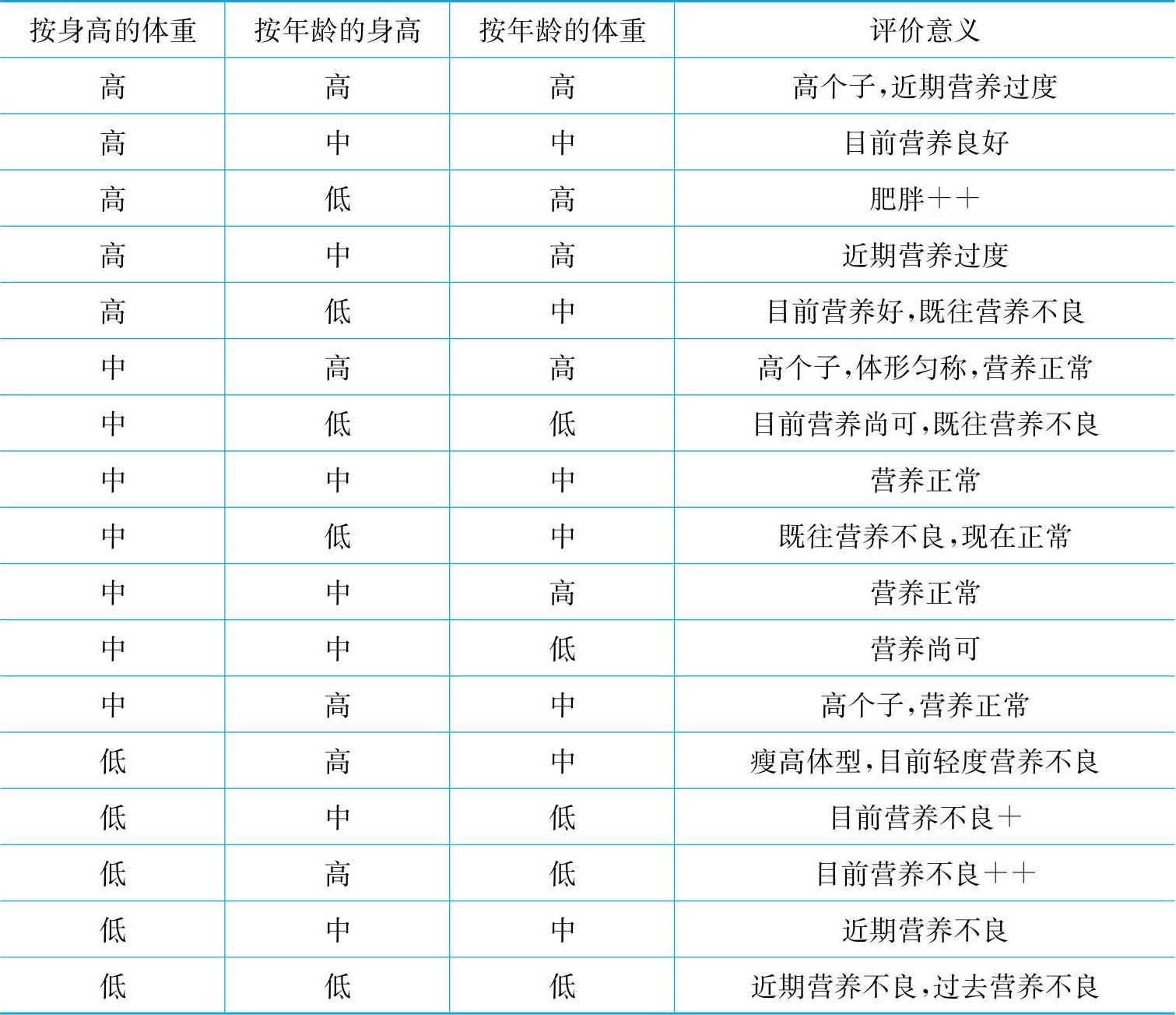 表2-1 儿童生长评价标准表