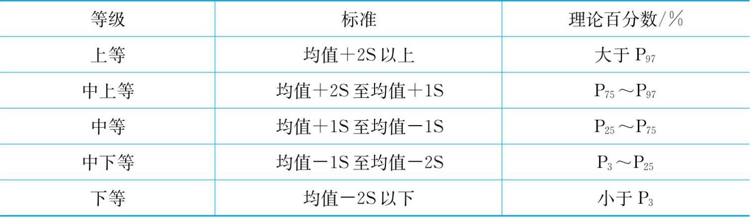 等级评价法是借助正态分布原理,以均值为基准值,标准差为离散距来划分等级范围(如表2-2所示)。生长发育标准按性别、年龄、均值和标准差呈现。凡实测值在均值±2S范围内均属正常(均值±2S的范围大约包括了95%的人群)。