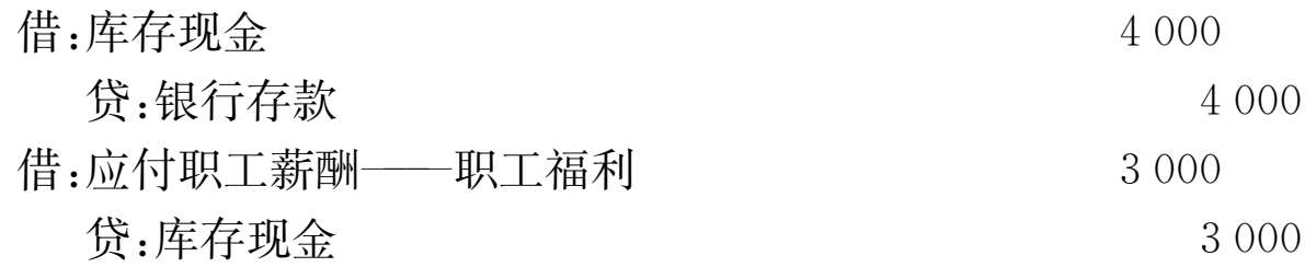 【 例3-12 】202×年12月24日,从银行取现4 000元,并用现金发放职工生活困难补助3 000元。