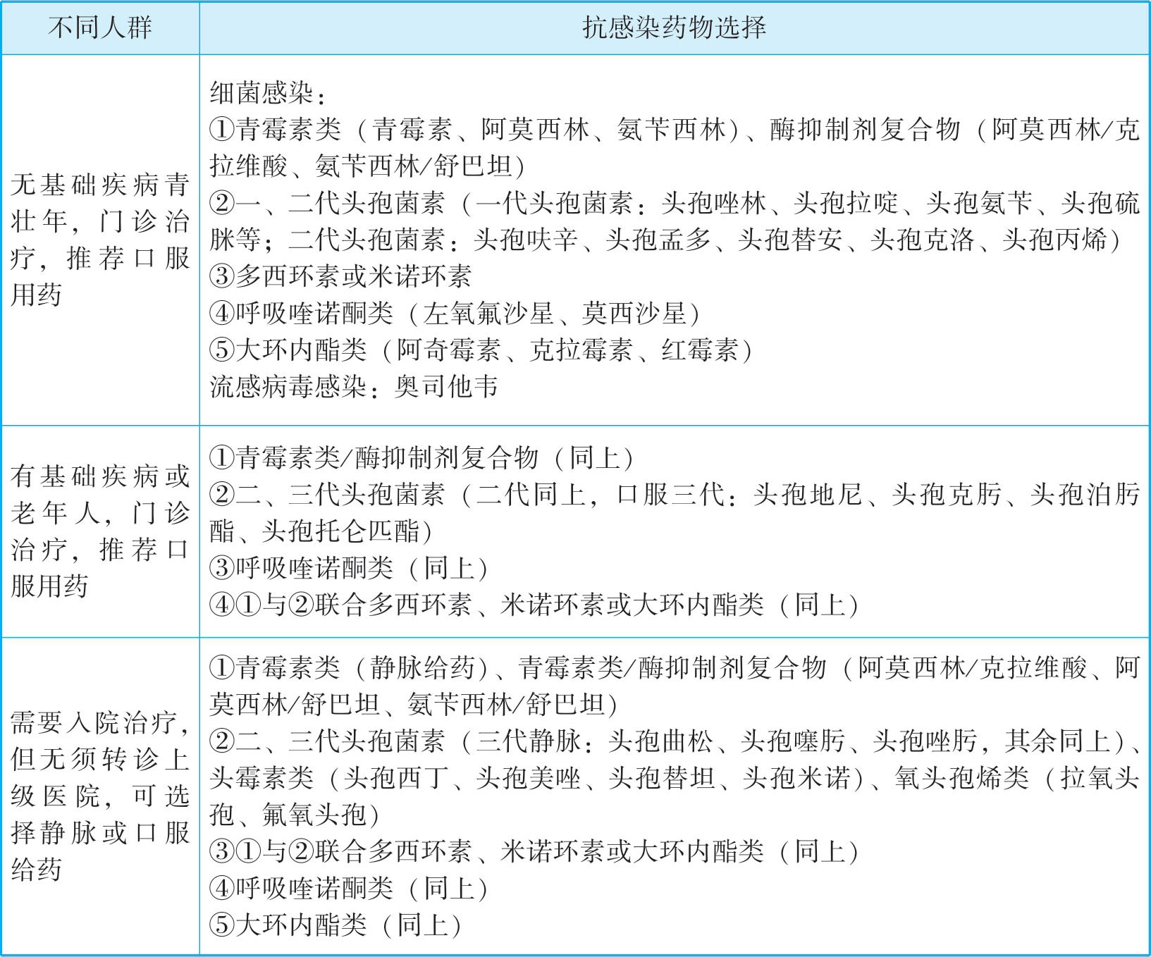 表3-2 不同人群社区获得性肺炎初始经验性抗感染治疗
