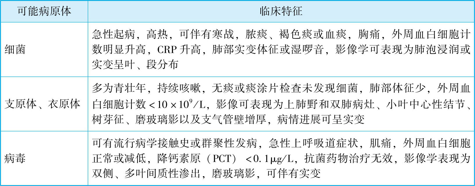 表3-1 不同病原体引起的肺炎鉴别诊断