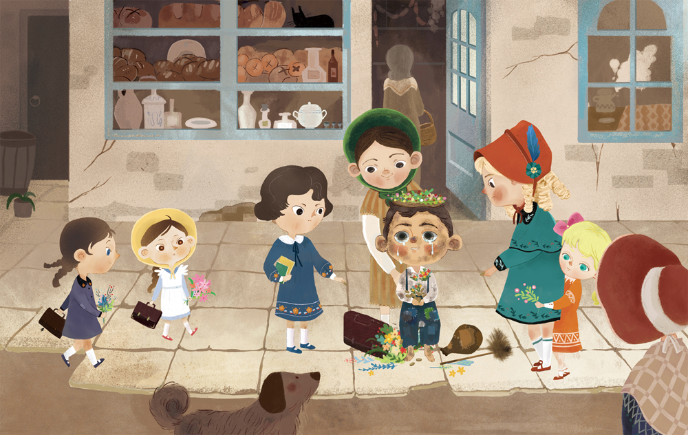在学校的大门前面,街道的另一边,站着一个清扫烟筒的男孩子,他的一只手臂靠在墙上,额头紧贴手臂。他个子瘦小,满脸黑烟,手里拿着他的口袋和刮板。他号啕大哭,时而抽噎两声。两三个二年级的女生走到他身边问道: