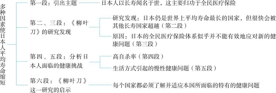 本段引出文章主题——日本人的长寿现象。句①和句 ②指出日本是世界上最长寿的国家。句③则指出日本人长寿的原因:遗传因素、文化因素、医疗保险等,其中,最主要原因是全民医疗保险。