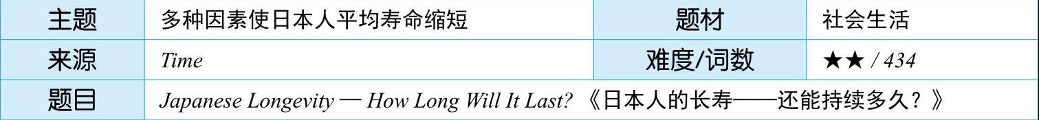 [文章大意] 从二十世纪五六十年代开始,日本便以国民的长寿闻名于世。医学杂志《柳叶刀》出版的一期专刊就探讨了日本人的长寿现象。但是研究发现,虽然日本仍然是世界上期望寿命最长的国家,但它很快就会被其他长寿国家超越。研究人员对这种趋势形成的原因以及日本人健康面临的全新挑战进行了分析。