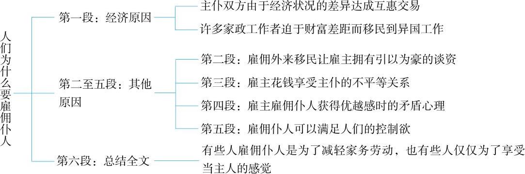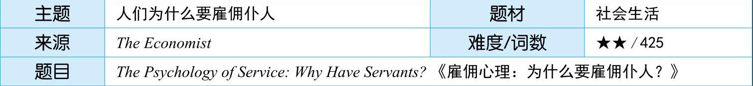 本段为文章的首段,引出全文的主题,即主仆关系存在的原因,同时还指出了原因之一——经济地位的差异。句①指出,主仆双方由于在经济和时间上互补,于是达成了一种互惠的交易。句②则用具体数据证明上述原因,从事家政工作的人多是被巨大的财富差距驱使而来的外来移民。