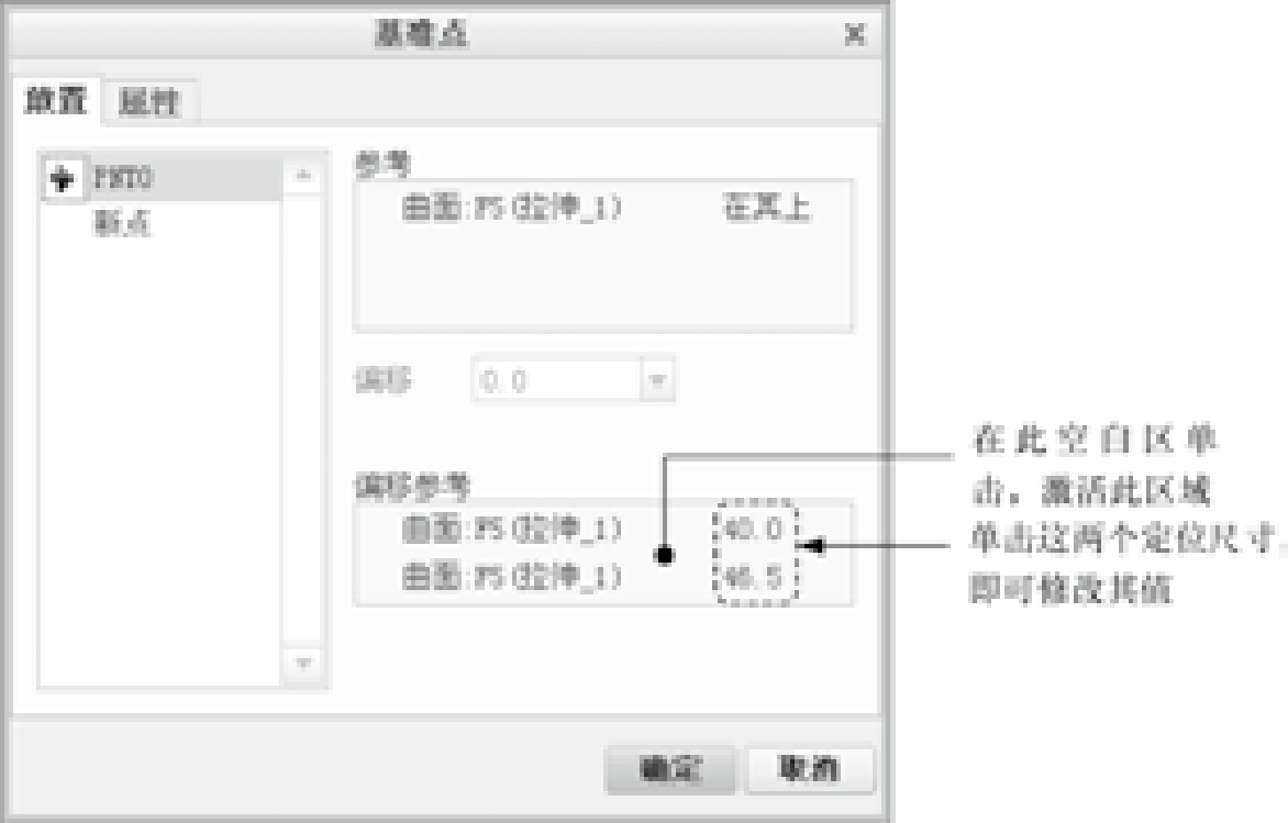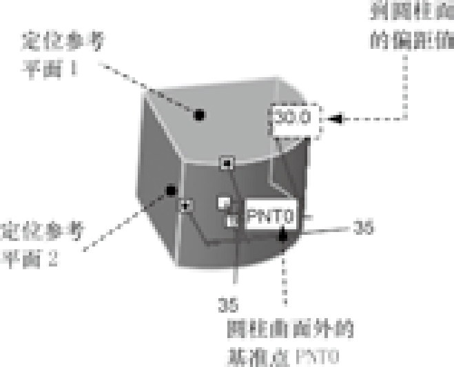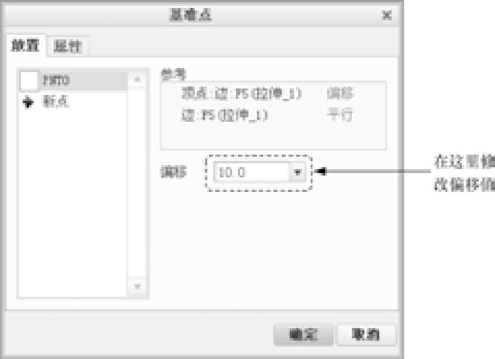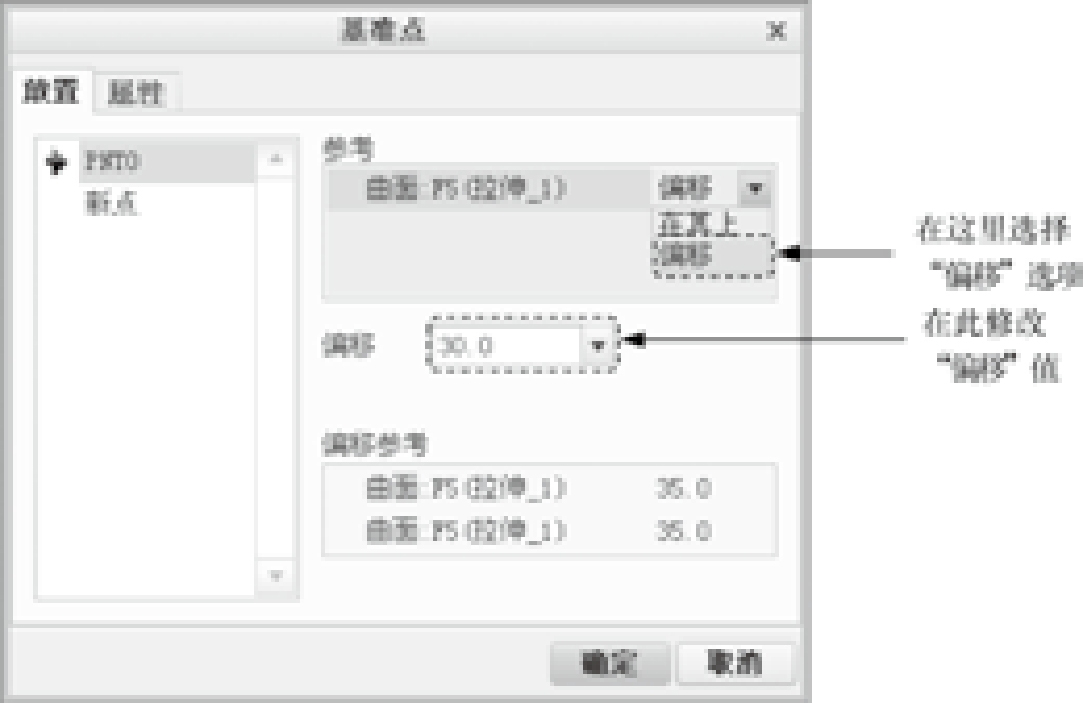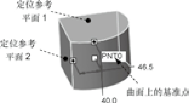 创建曲面的偏距基准点,就是先假想将曲面偏移一定距离,然后在其上创建基准点。此时应选取该曲面为参考并指定偏移距离,然后参考两平面(边)对基准点进行定位。