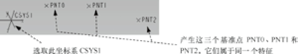 如图3.1.9所示,现需要相对坐标系CSYS1创建三个基准点PNT0、PNT1和PNT2,其坐标值分别为(10.0,5.0,0.0)、(20.0,5.0,0.0)和(30.0,0.0,0.0)。操作步骤如下。