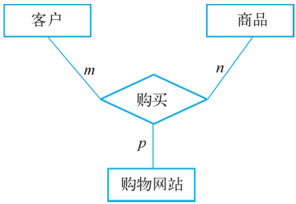 实际上,经常出现多个实体相互联系的情况。如客户在网购中,涉及客户、购物网站和商品三者之间的关系,客户通过购物网站购买商品,其中的每两个实体间都是多对多的联系。一个客户可以购买多种商品,每种商品可以被不同的客户购买。每个客户都可以到不同的购物网站购物,每个购物网站都可以为不同的客户服务。每个购物网站都可以出售多种商品,每种商品都可由不同的购物网站销售。网购联系对应的E-R图如图1-11所示。