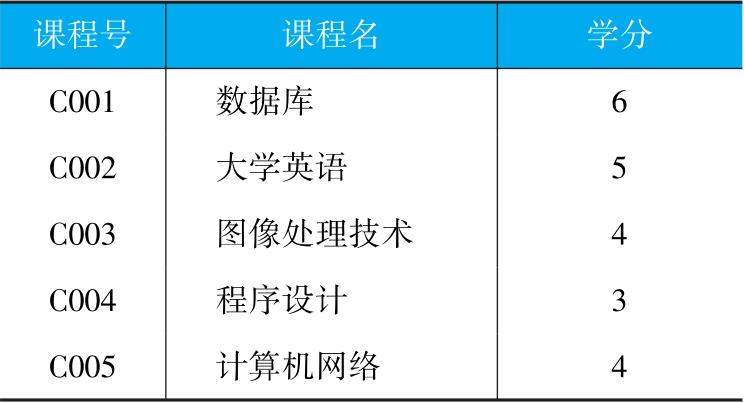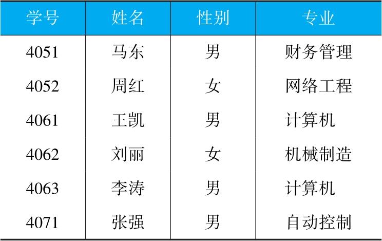 【案例1-6】 高校学生与所选课程之间为多对多联系,每个学生允许选修多门课程,每门课程允许多个学生选修。表1-3为学生数据表,表1-4为课程数据表,图1-8为多对多选课联系。