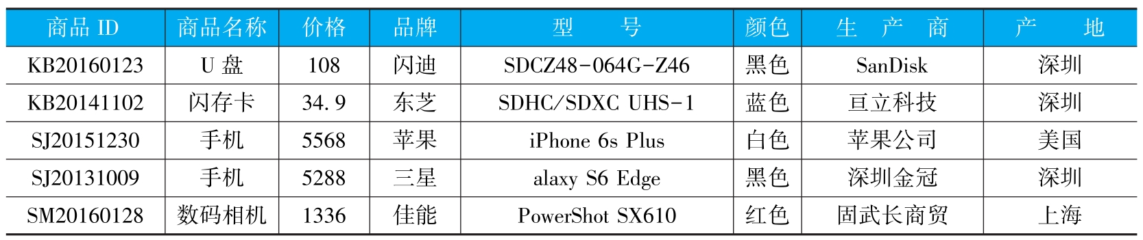 【案例1-8】 数码商品的关系示例如表1-5所示。该关系的型为(商品ID,商品名称,价格,品牌,型号,颜色,生产商,产地),关系的元组(行)数为5,关系的属性(列)数为8,其中第一列的属性名为“商品ID”。属性的取值范围称为属性的域,如价格属性的域为货币型数,商品名称的域为字符型。