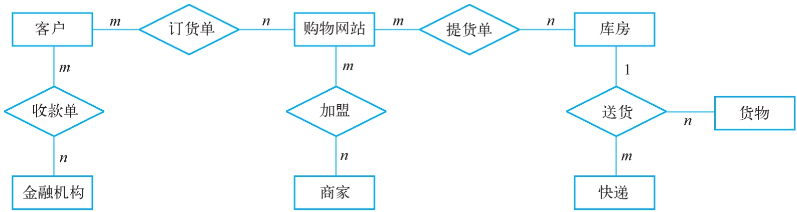 上述“订货单”联系的购物网站和客户是多对多联系,每个购物网站都可以为多个客户服务,每个客户都可以到不同的购物网站订购不同的货物。“收款单”联系的客户和金融机构也是多对多联系,每个金融机构都可以为多个客户服务,每个客户都可以到不同金融机构交款。同样,“提货单”联系的购物网站和库房也是多对多联系,库房可为各网站服务,购物网站可凭提货单取货。