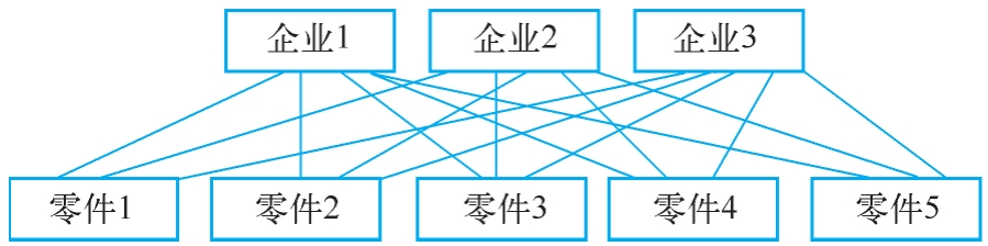 网状模型(Network Model) 是对层次模型的扩展,允许一个以上的节点无双亲,同时也允许一个节点可以有多于一个的双亲。图1-14所示是几个企业和生产零件的网状模型。