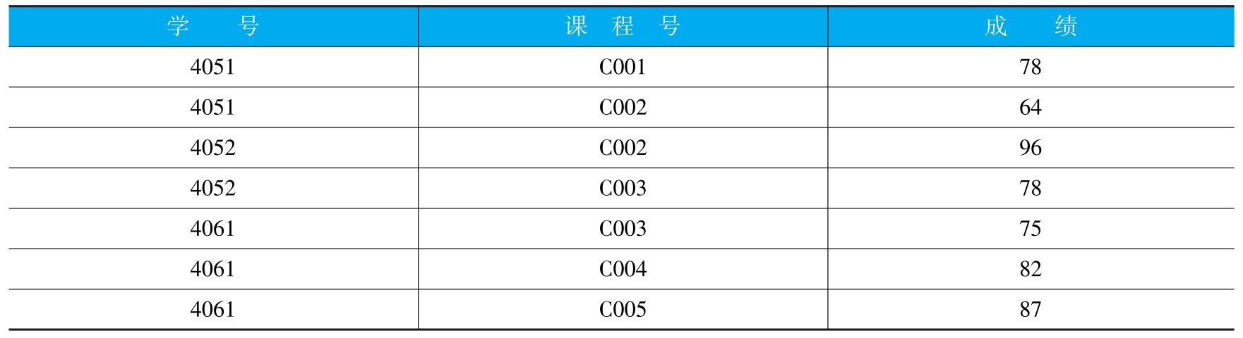 关系模型可以用“二维表”简单表示实体及其联系,对应某个关系,包括相联系的各实体的键。如表1-3、表1-4和图1-8所示的学生、课程及选课联系,对应的关系模型包含三个关系,即学生关系、课程关系和选课关系。选课联系所对应的关系如表1-6所示,这里对选课联系增加了“成绩”属性,其语义是学生选修课程的成绩。