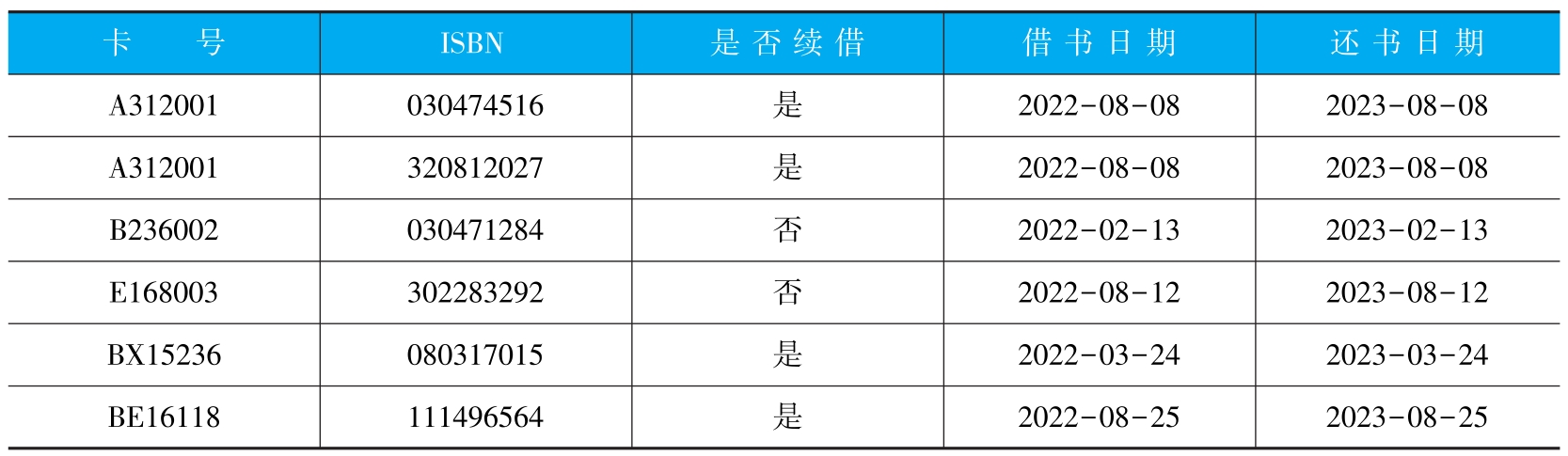 【案例1-5】 对于学生的“借阅”联系,联系型可以包括卡号、ISBN、是否续借、借书日期、还书日期等属性,其中卡号和ISBN分别对应“图书卡”实体和“图书”实体。表1-2中的第一行为借阅联系的型,其后各行为借阅联系型的值(借阅记录)。