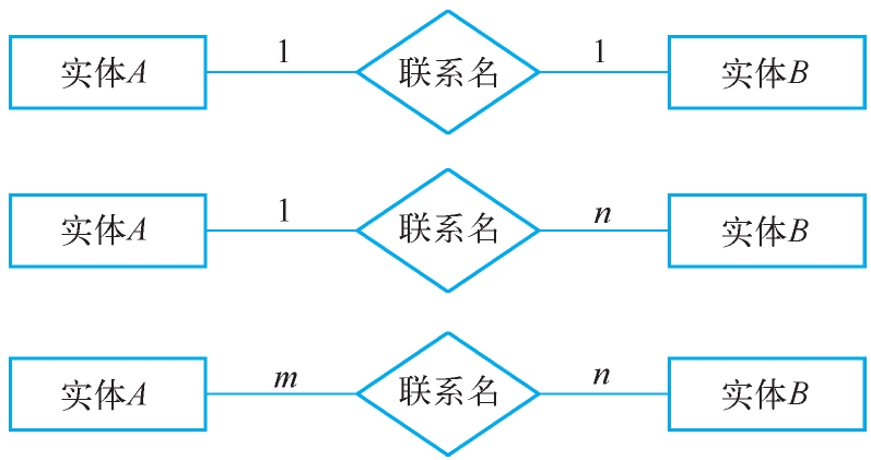两个实体之间的三种联系 包括一对一、一对多和多对多,对应的E-R图如图1-9所示。为了表示的简洁性,并没有对每个实体画出其属性及属性实体间的连线。