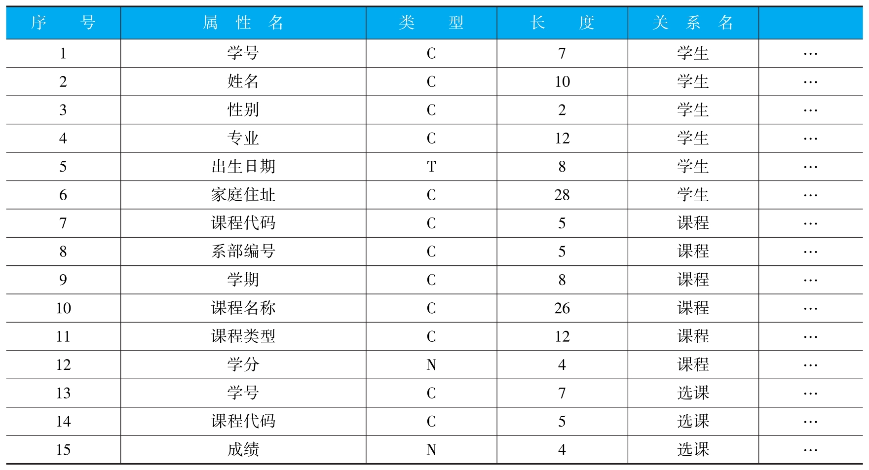 ,其提供了数据库中所有关系的模式(即关系的型)。元关系是在用户建立数据库应用系统时,是由DBMS根据该数据库中每个关系的模式自动定义(保存数据表结构备用)的。学生选课关系模型的元关系(结构)如表1-7所示。