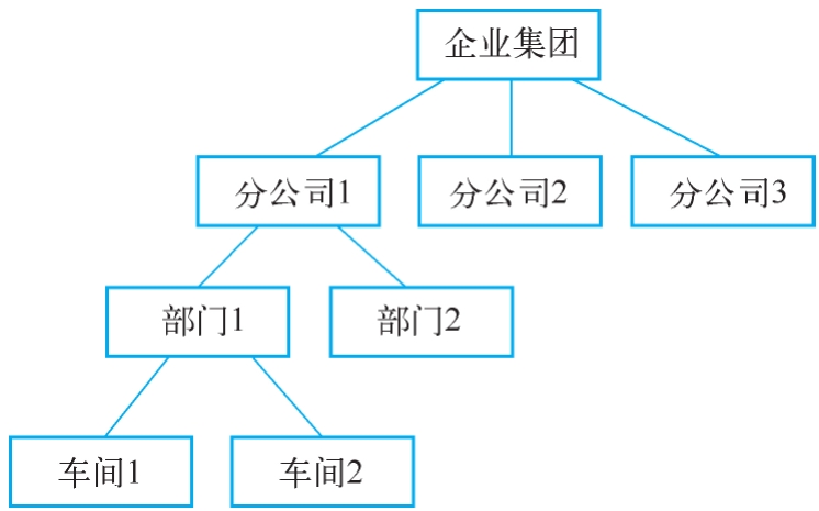 层次模型(Hierarchical Model) 用树形结构表示现实世界中的实体及其之间的联系,有且只有一个无双亲的根节点,其余节点为其子节点。除根节点外,每个节点都有且仅有一个 父节点 (也称 双亲节点 ),可以没有,也可以有一个或多个子节点。没有子节点的节点被称为叶。每个节点都表示一个记录类型,即概念模型中的一个实体型,每对节点的父子联系为一对多联系,只有一个子节点时为一对一联系。图1-13所示为企业组织层次结构的层次模型。企业集团为根节点,有多个分公司,分公司1有两个子节点(部门),部门1又有两个子节点(车间),车间是叶。
