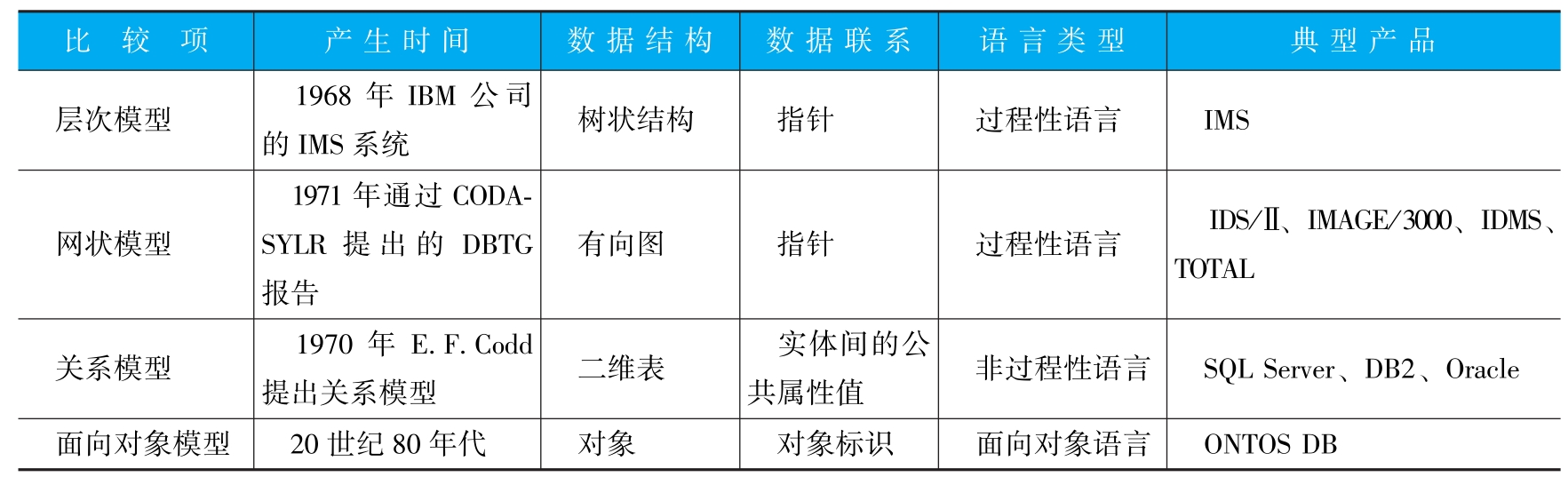 为了更进一步地加深理解上述四种模型,从产生时间、数据结构、数据联系和语言类型等方面进行对比,如表1-8所示。